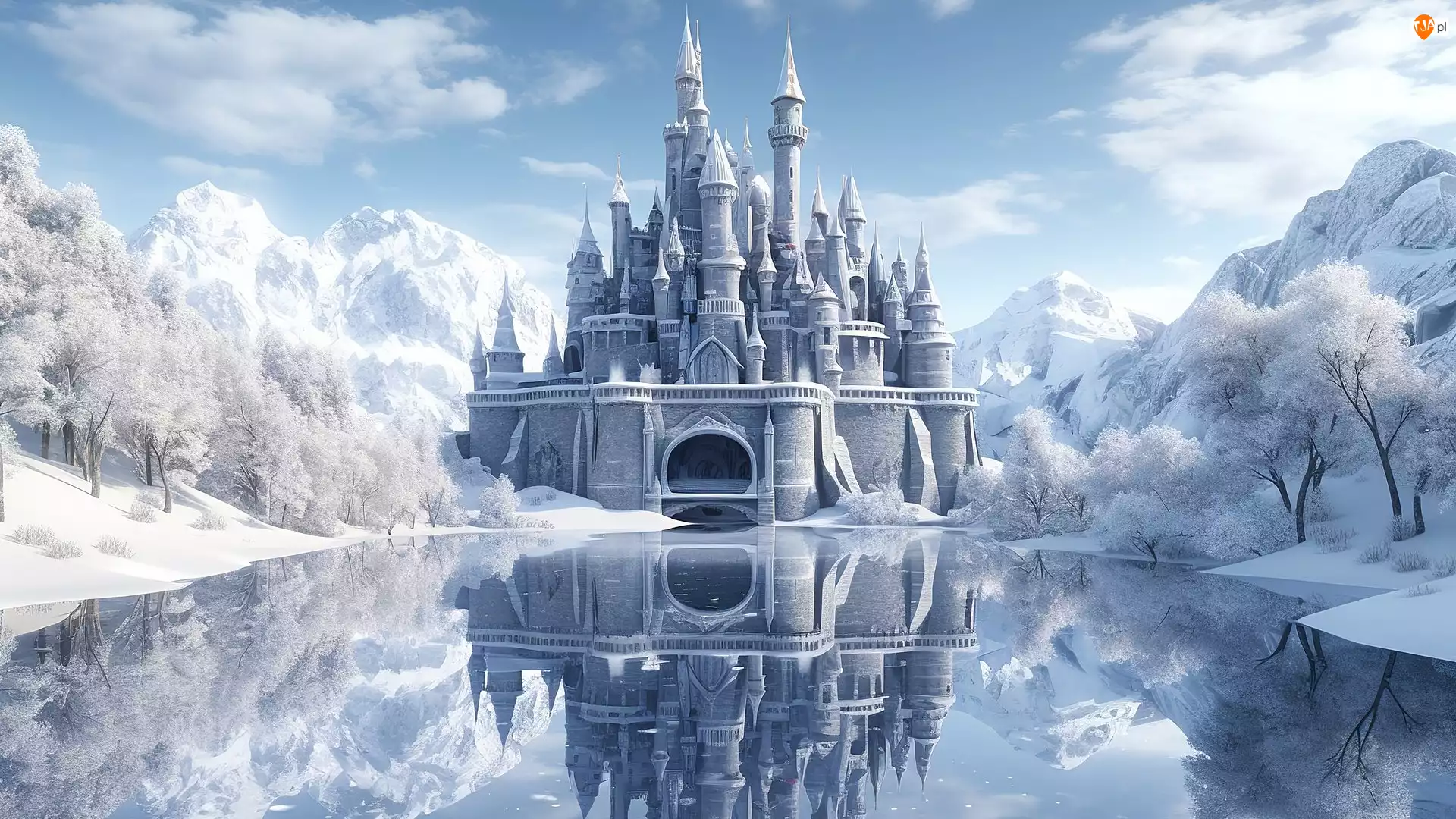 Jezioro, Góry, Zamek, Zima, Drzewo