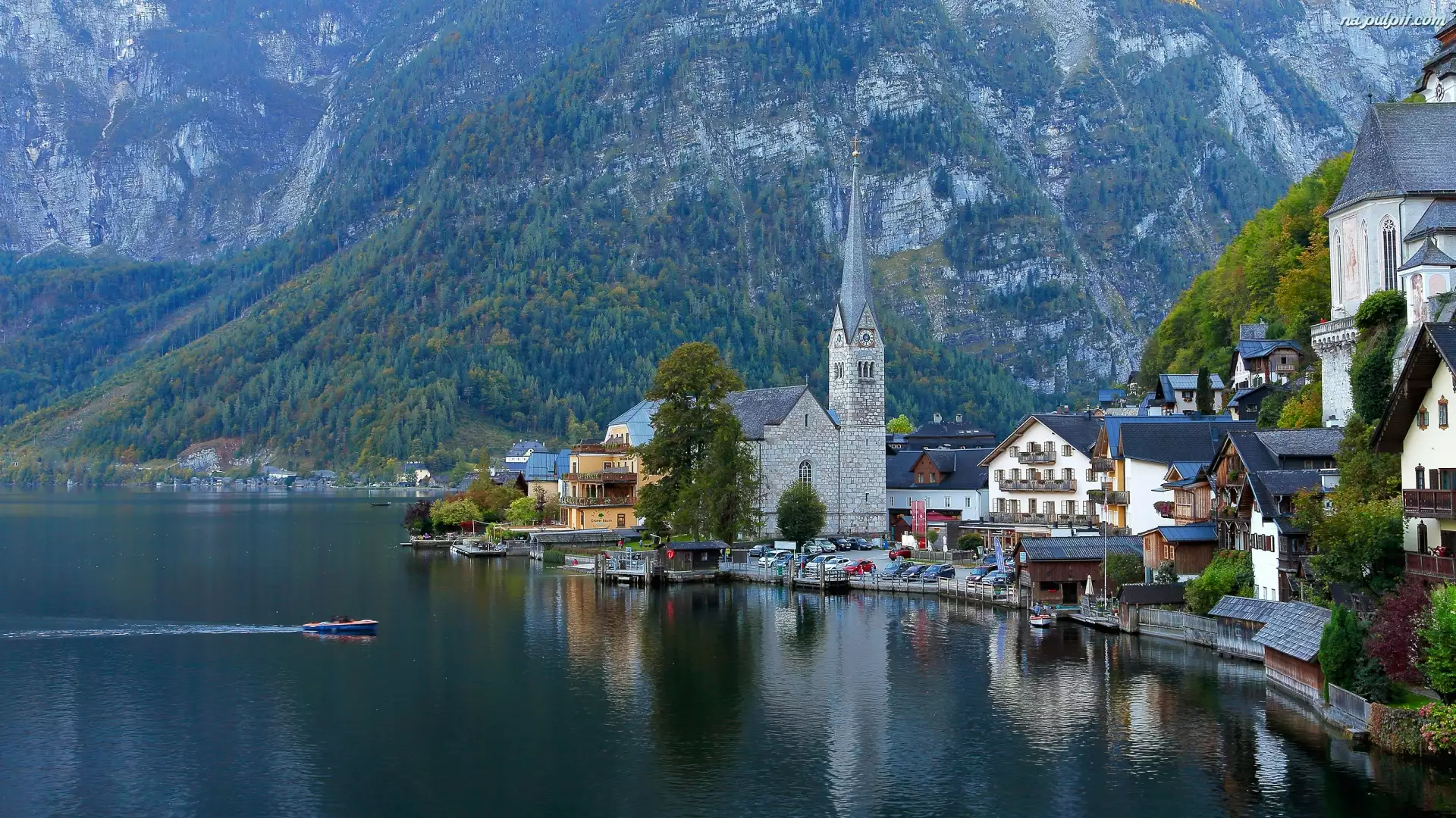 Jezioro Hallstattersee, Hallstatt, Drzewa, Góry, Lasy, Miasteczko, Domy, Austria, Kościół