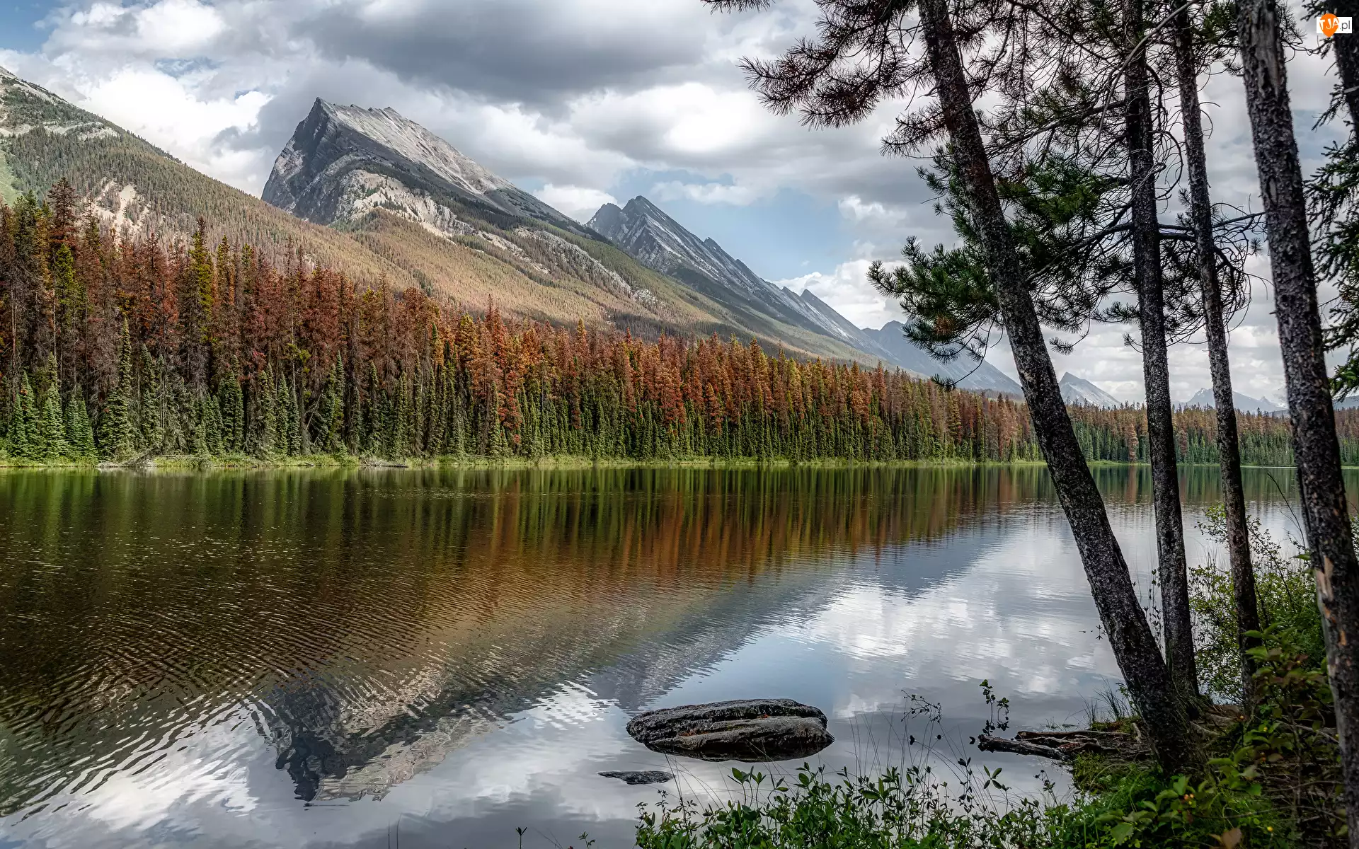 Park Narodowy Jasper, Las, Jezioro, Alberta, Drzewa, Honeymoon Lake, Kanada, Góry