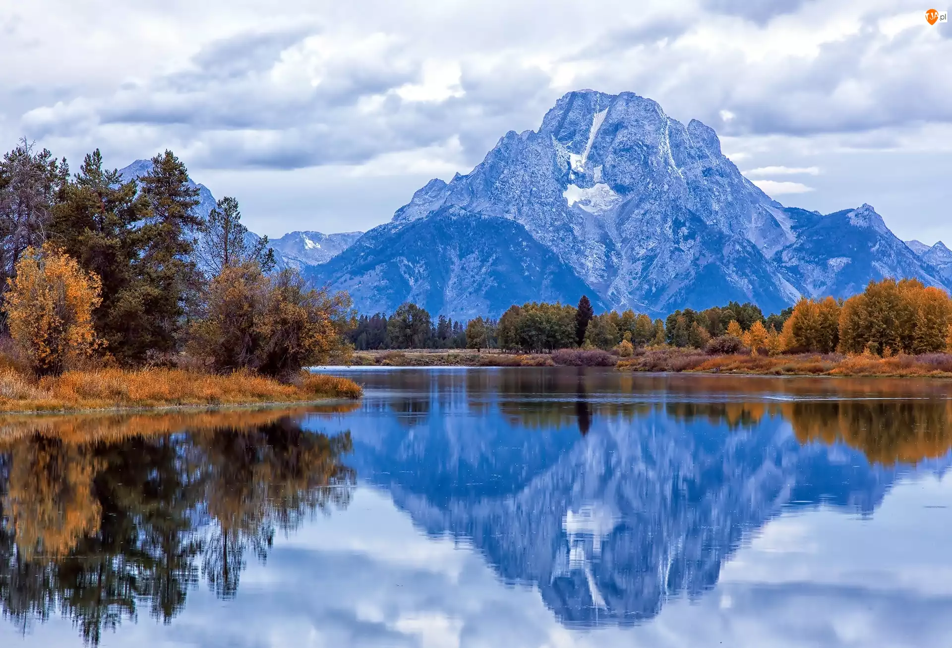 Jezioro Jackson Lake, Jesień, Stan Wyoming, Góry, Stany Zjednoczone, Szczyt Mount Moran, Park Narodowy Grand Teton, Drzewa