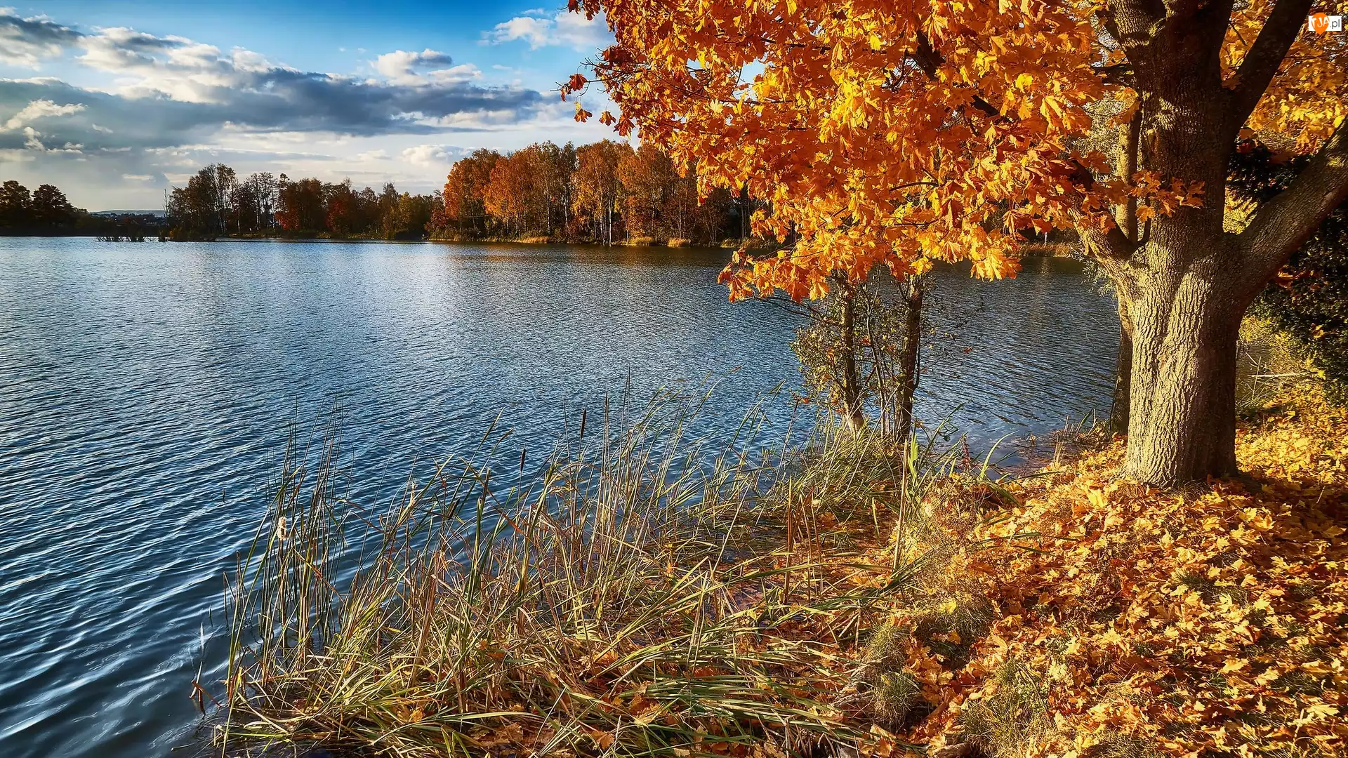 Jezioro, Jesień, Żółte, Trawa, Drzewa, Liście