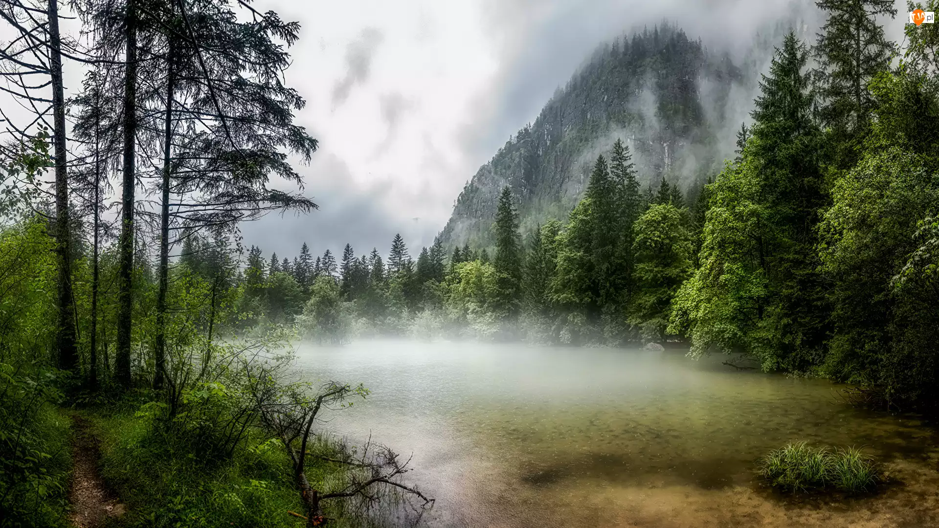 Jezioro Koppenwinkellacke, Ścieżka, Austria, Góry, Obertraun, Mgła, Drzewa