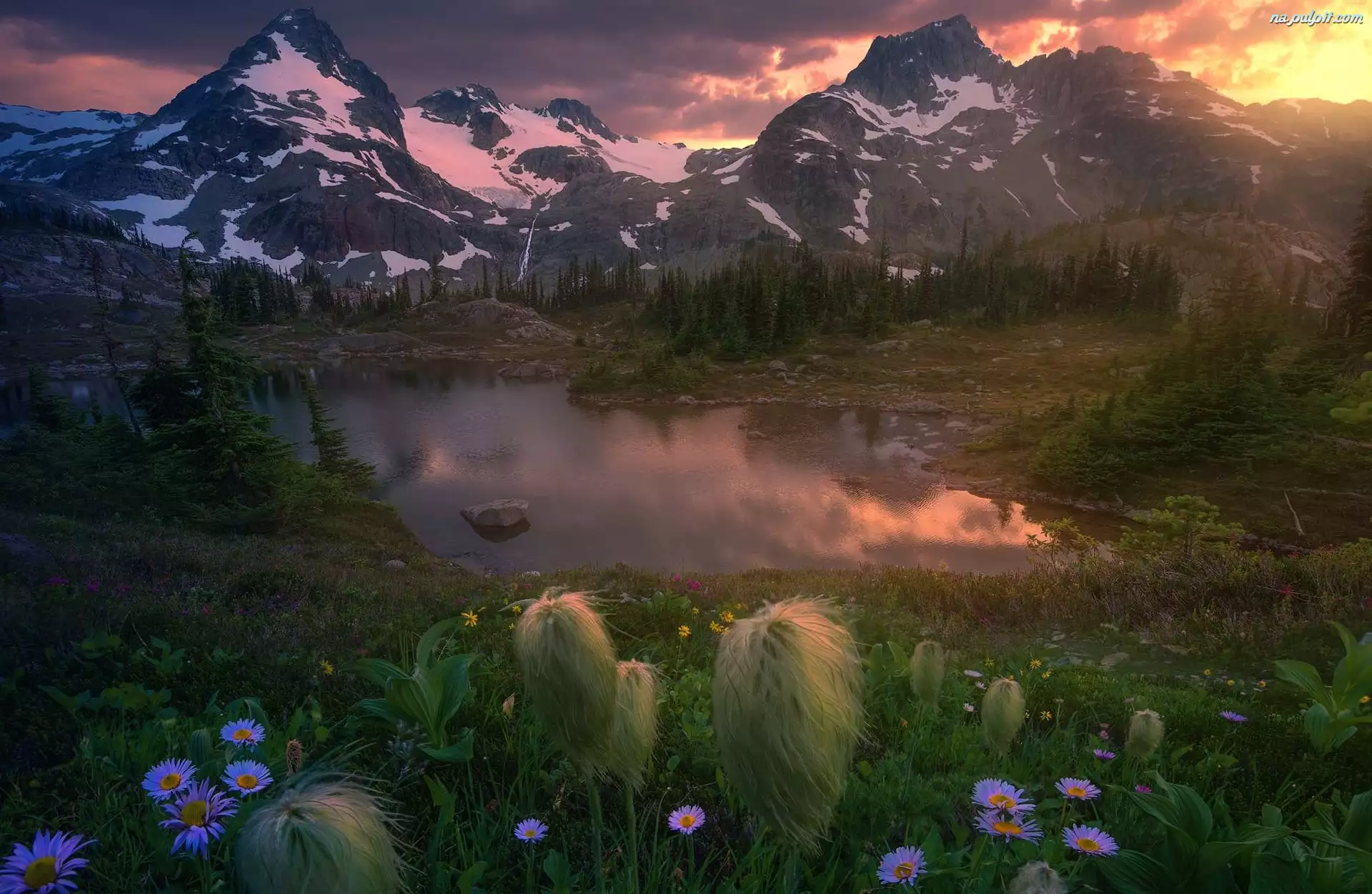 Jezioro, Kwiaty, Góry, Śnieg, Drzewa