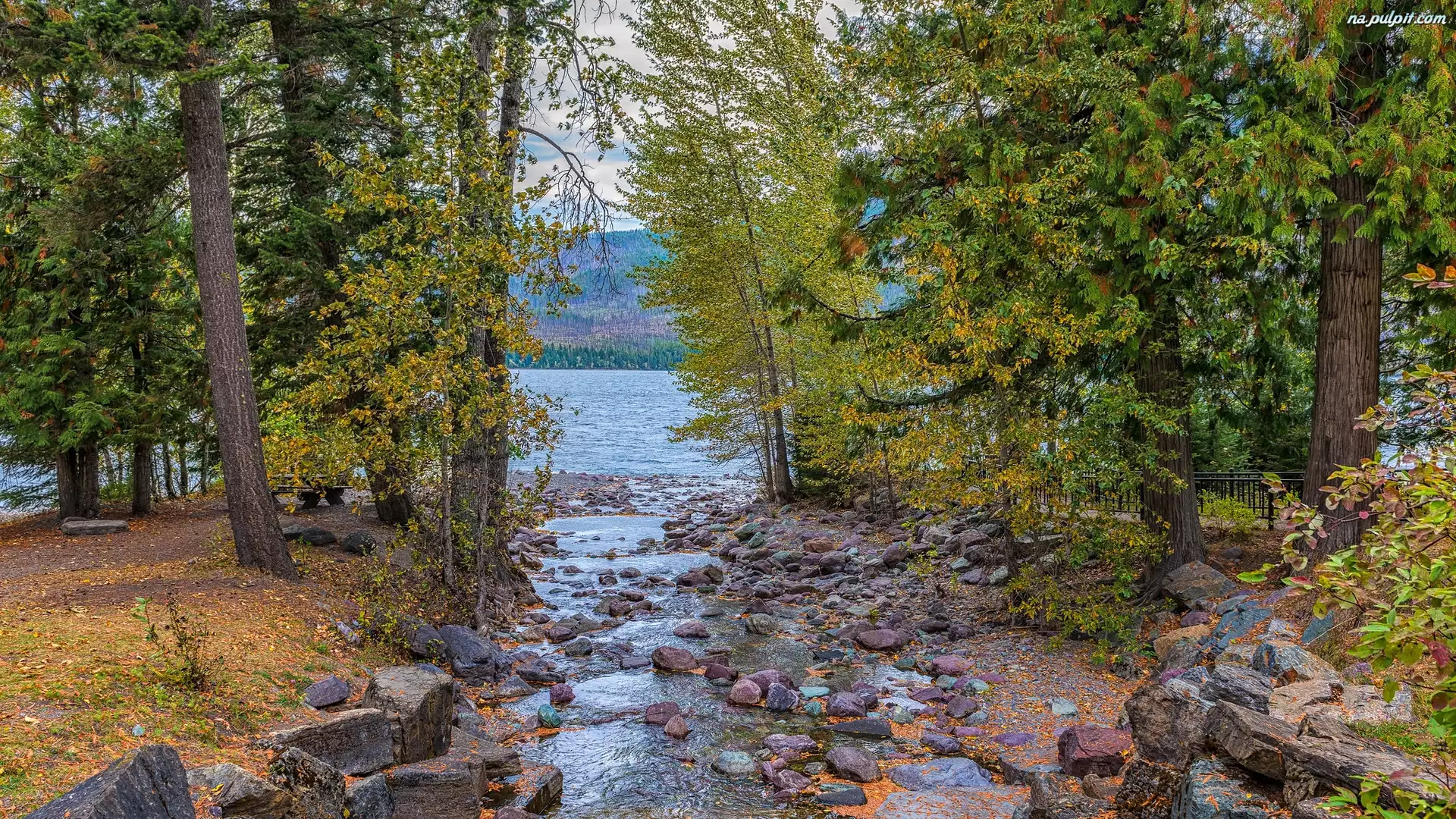 Jezioro, Lake McDonald, Stany Zjednoczone, Drzewa, Montana, Park Narodowy Glacier, Kamienie