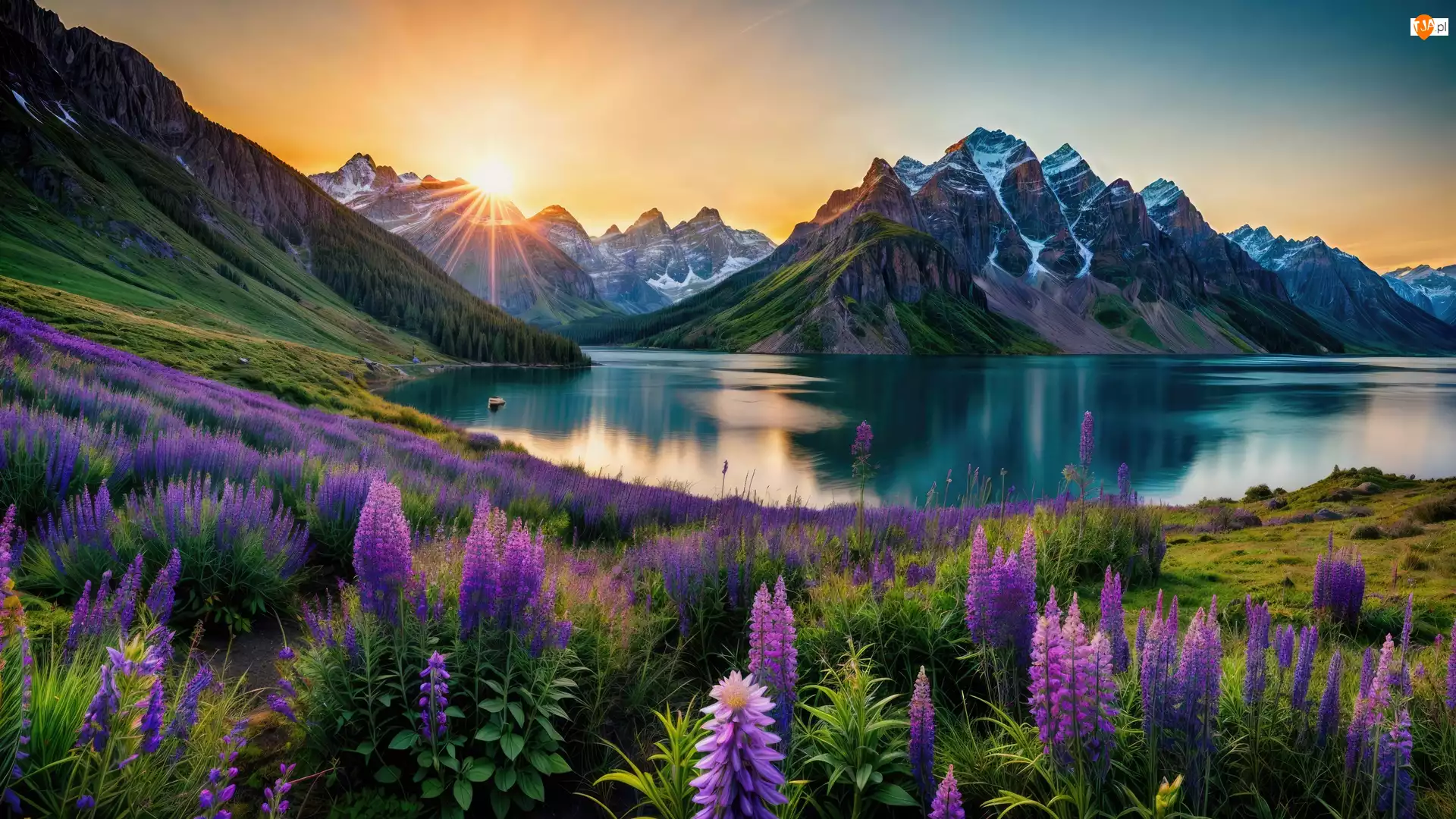 Jezioro, Las, Łąka, Gory, Wschód słońca, Łubin, Drzewa