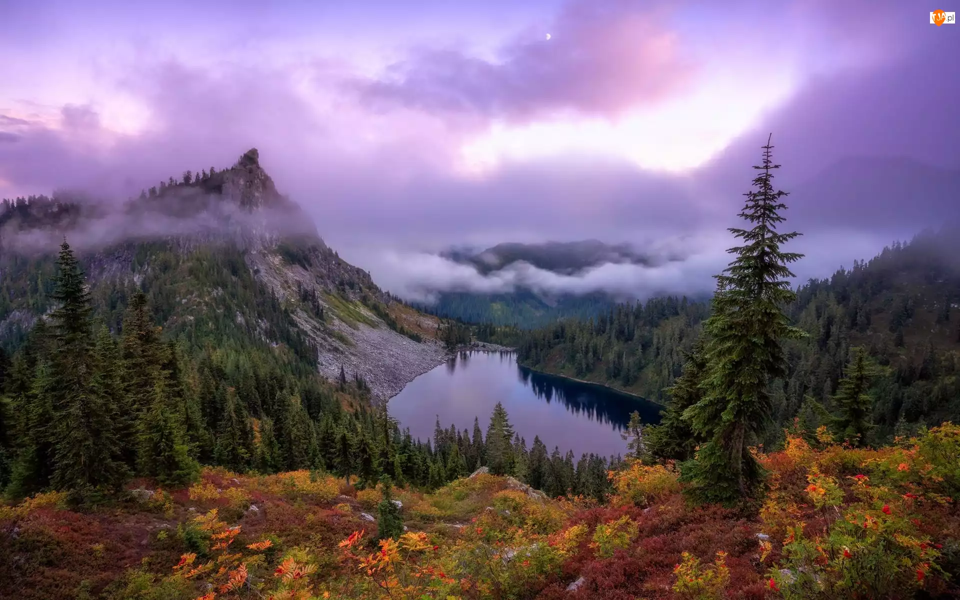 Stany Zjednoczone, Lake Valhalla, Stan Waszyngton, Mgła, Chmury, Góry Kaskadowe, Drzewa, Jezioro, Zieleń