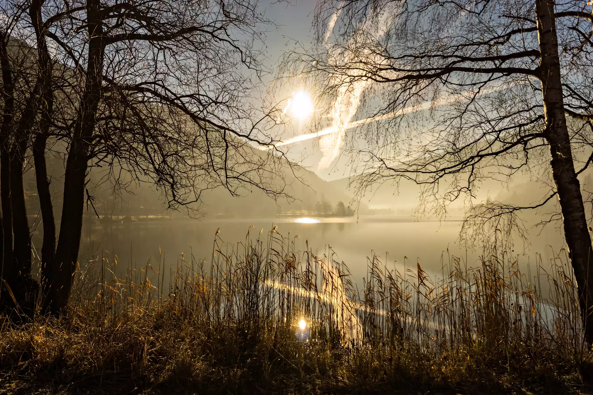 Jezioro, Mgła, Góry, Świt