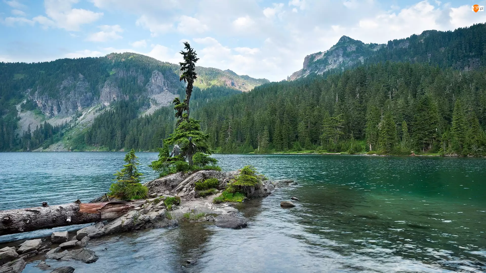 Jezioro, Mowich Lake, Stany Zjednoczone, Góry, Stan Waszyngton, Park Narodowy Mount Rainier, Drzewa