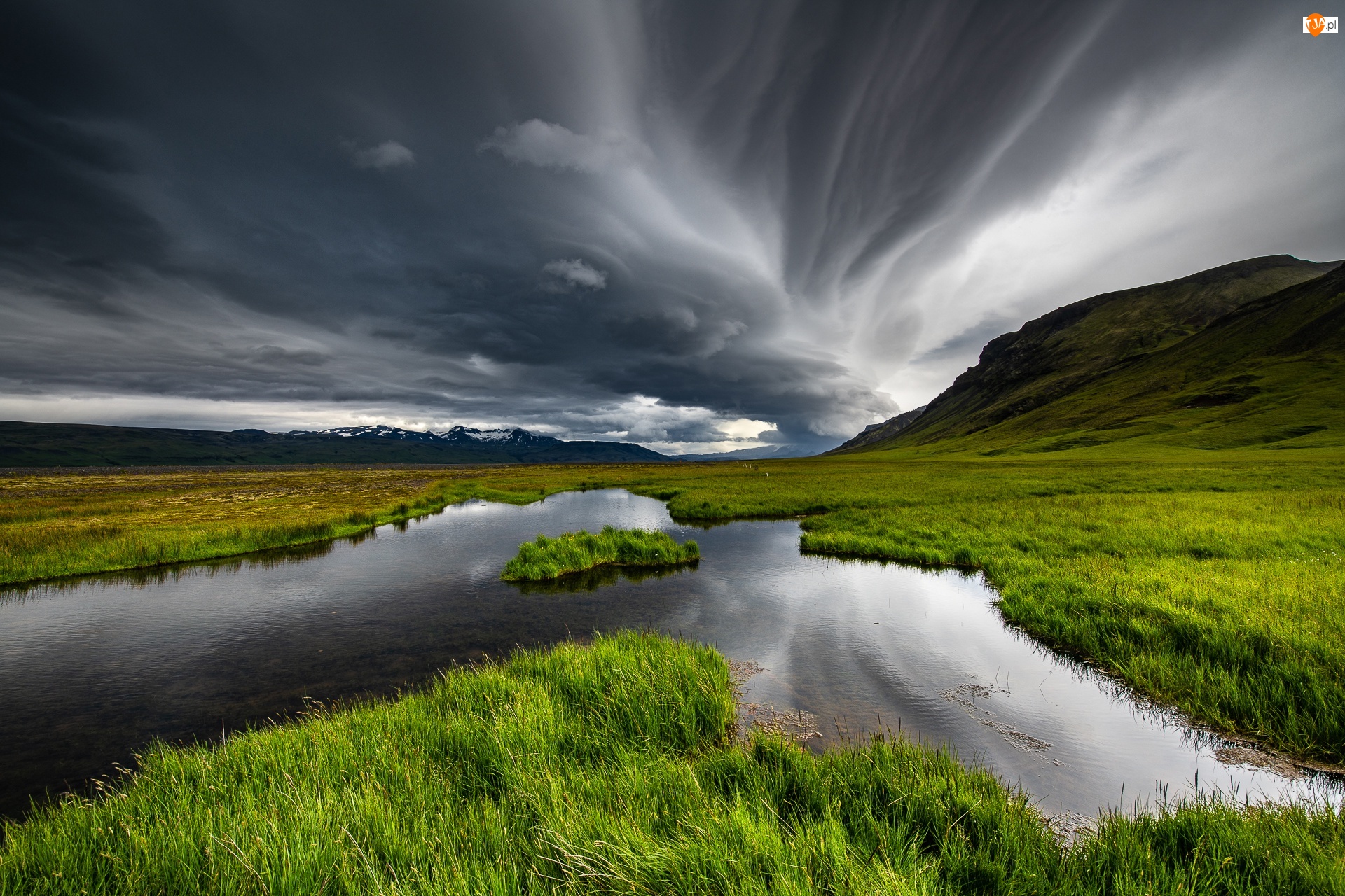 Góra, Chmury, Łąka, Jezioro, Ciemne