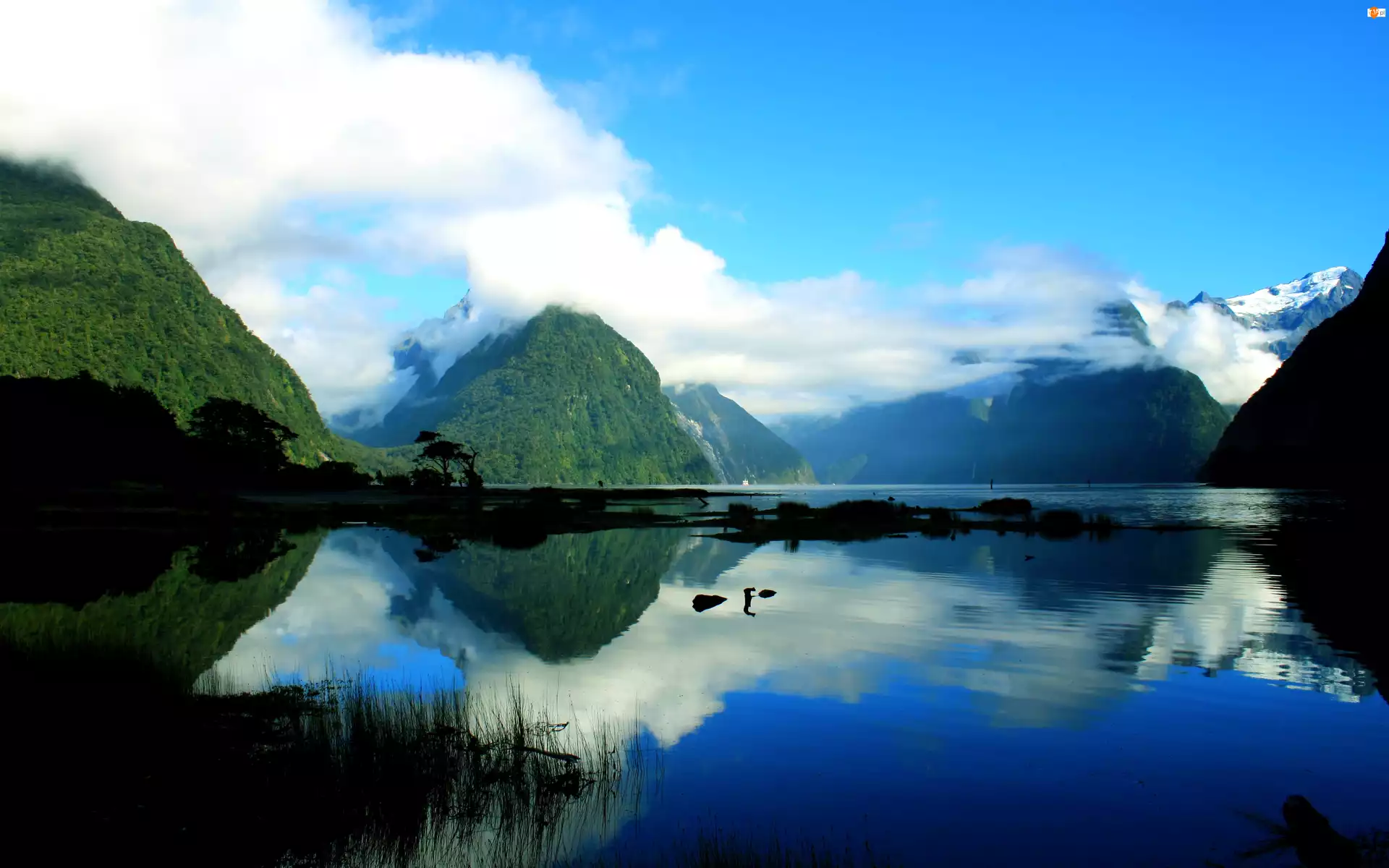 Jezioro, Odbicie, Góry, Chmury