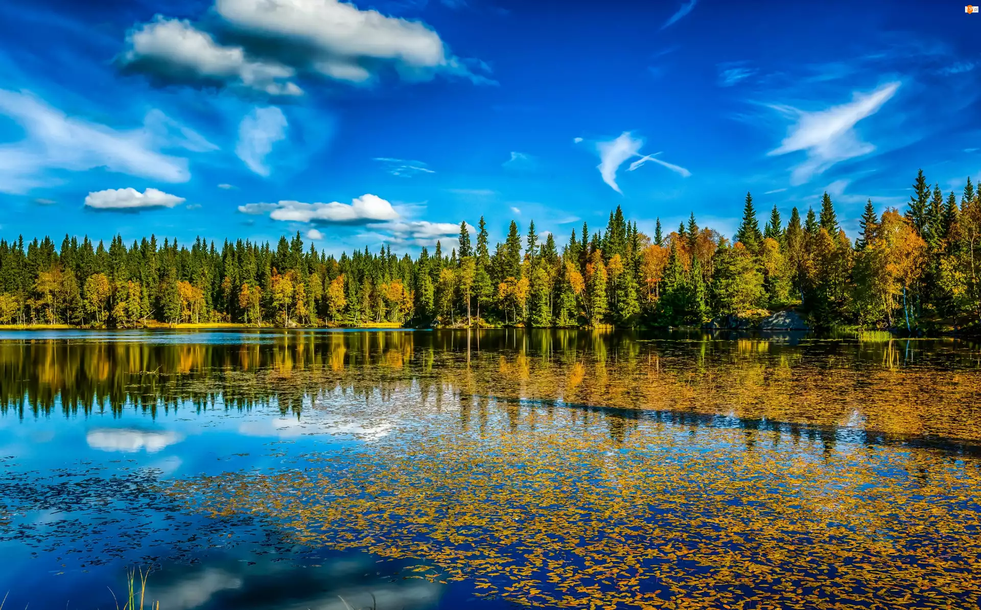Jesień, Jezioro, Las, Drzewa