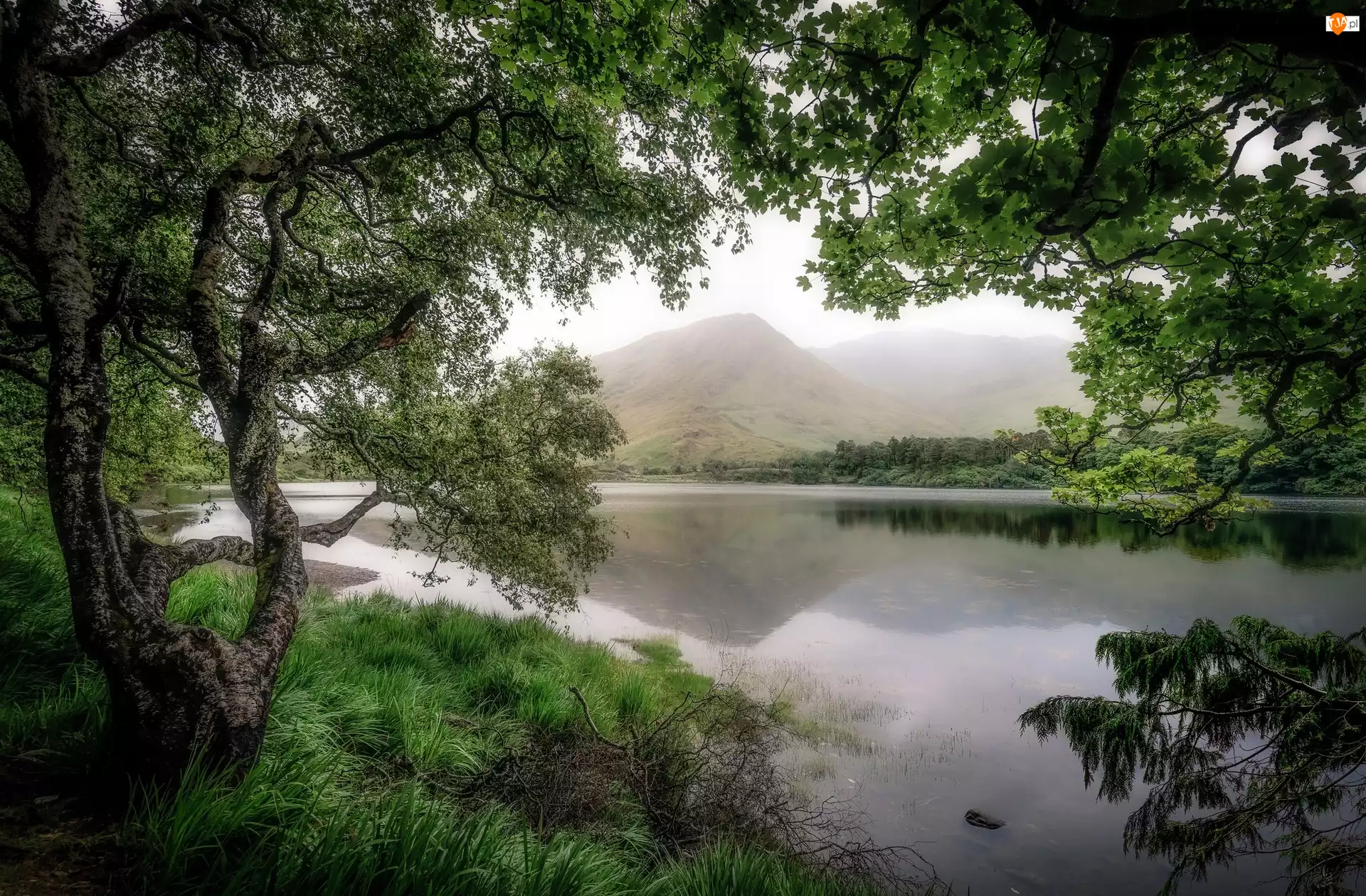Jezioro Pollacapall, Drzewa, Galway, Irlandia, Góry, Region Connemara