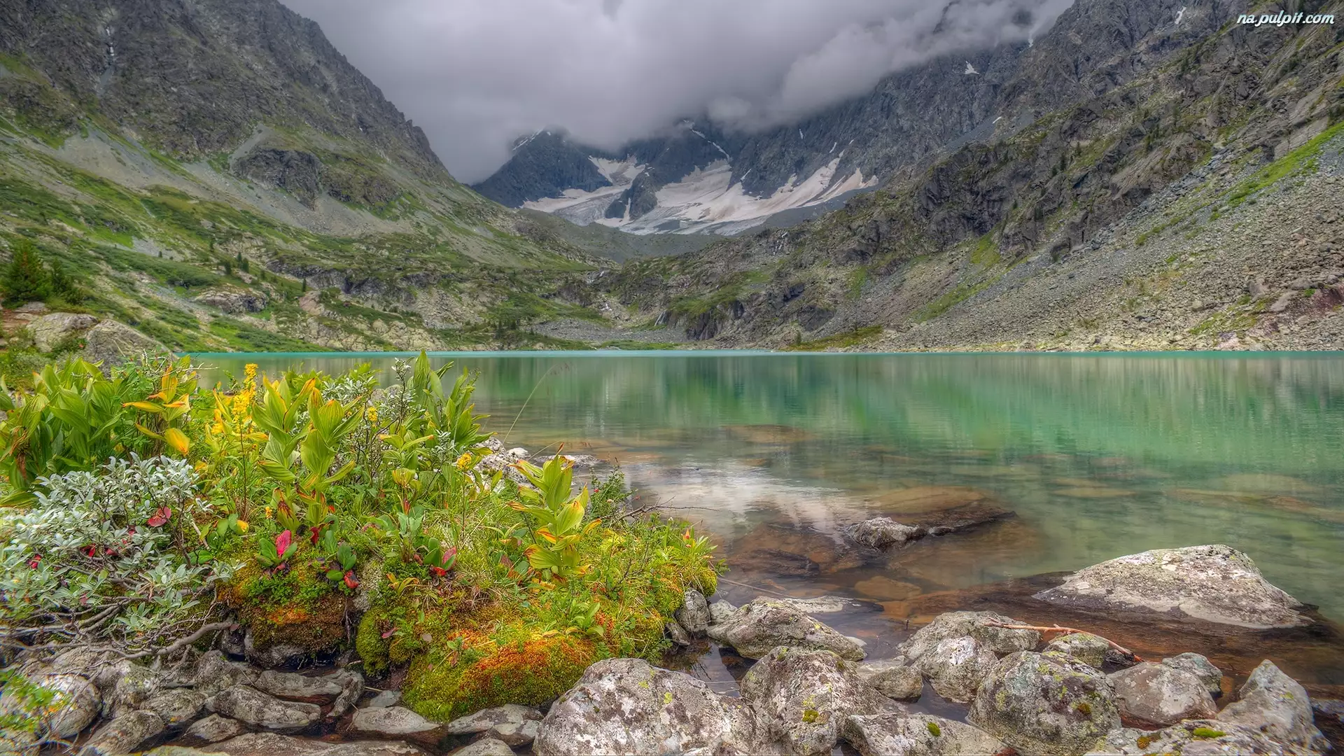 Jezioro, Rośliny, Chmury, Góry, Kamienie