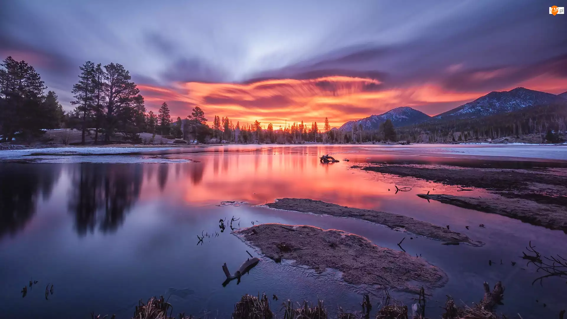 Kolorado, Park Narodowy Gór Skalistych, Wschód słońca, Stany Zjednoczone, Drzewa, Spraque Lake, Jezioro