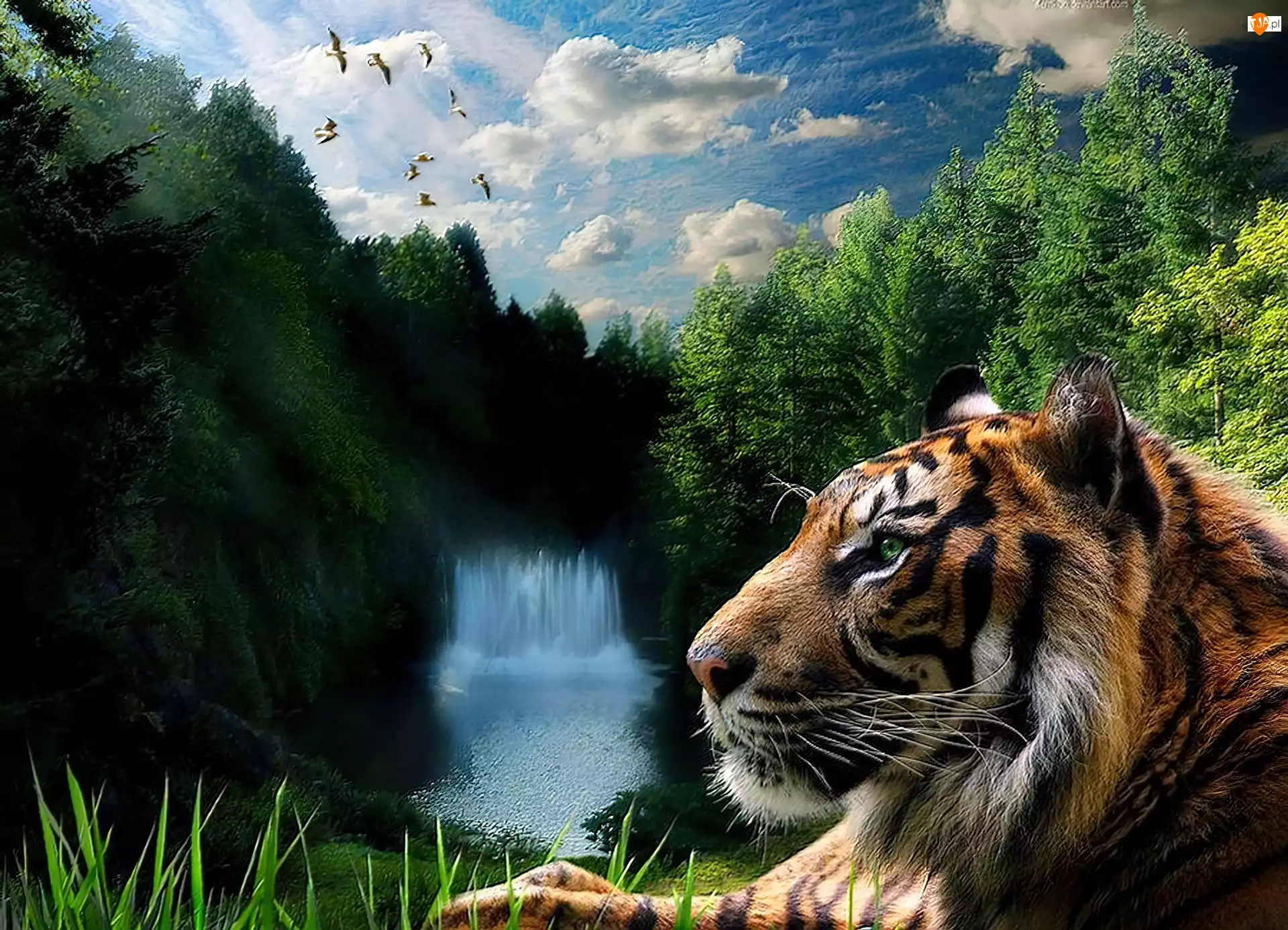Jezioro, Tygrys, Chmury, Las, Łąka