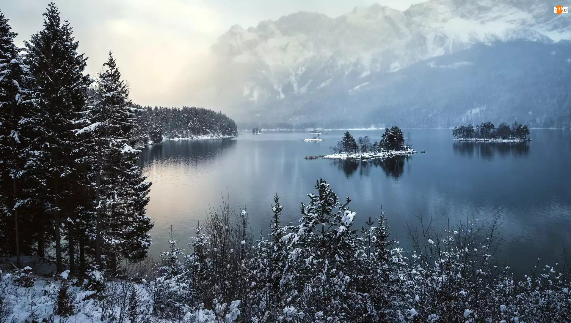 Bawaria, Zima, Góry, Niemcy, Drzewa, Jezioro, Alpy Bawarskie