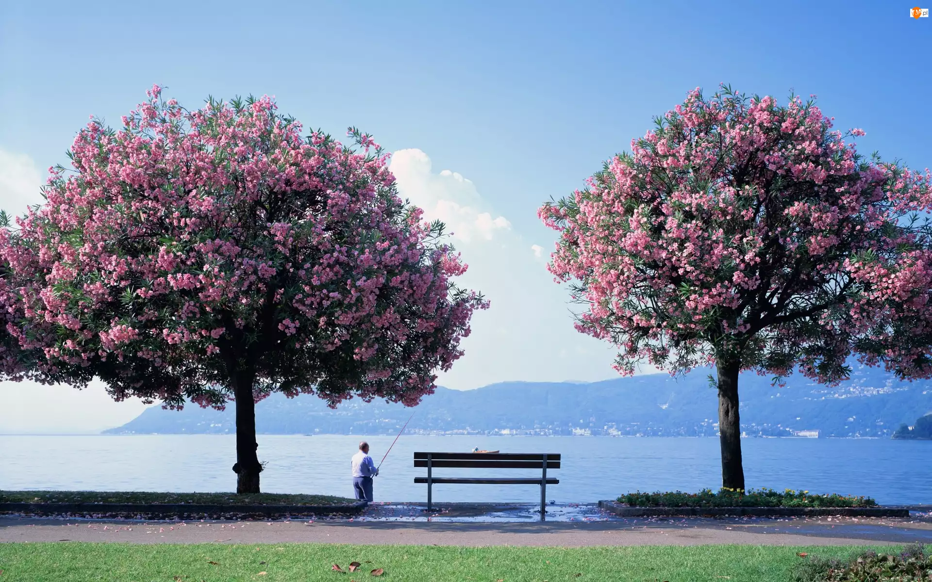 Drzewa, Kwitnące, Góry, Wiosna, Jezioro, Wędkarz