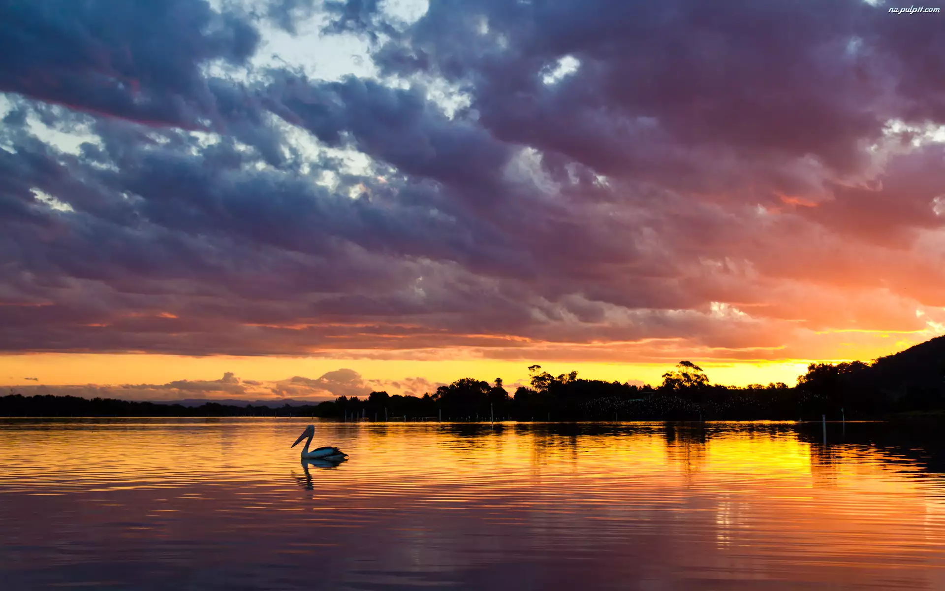 Jezioro, Zachód, Chmury, Słońca, Woda