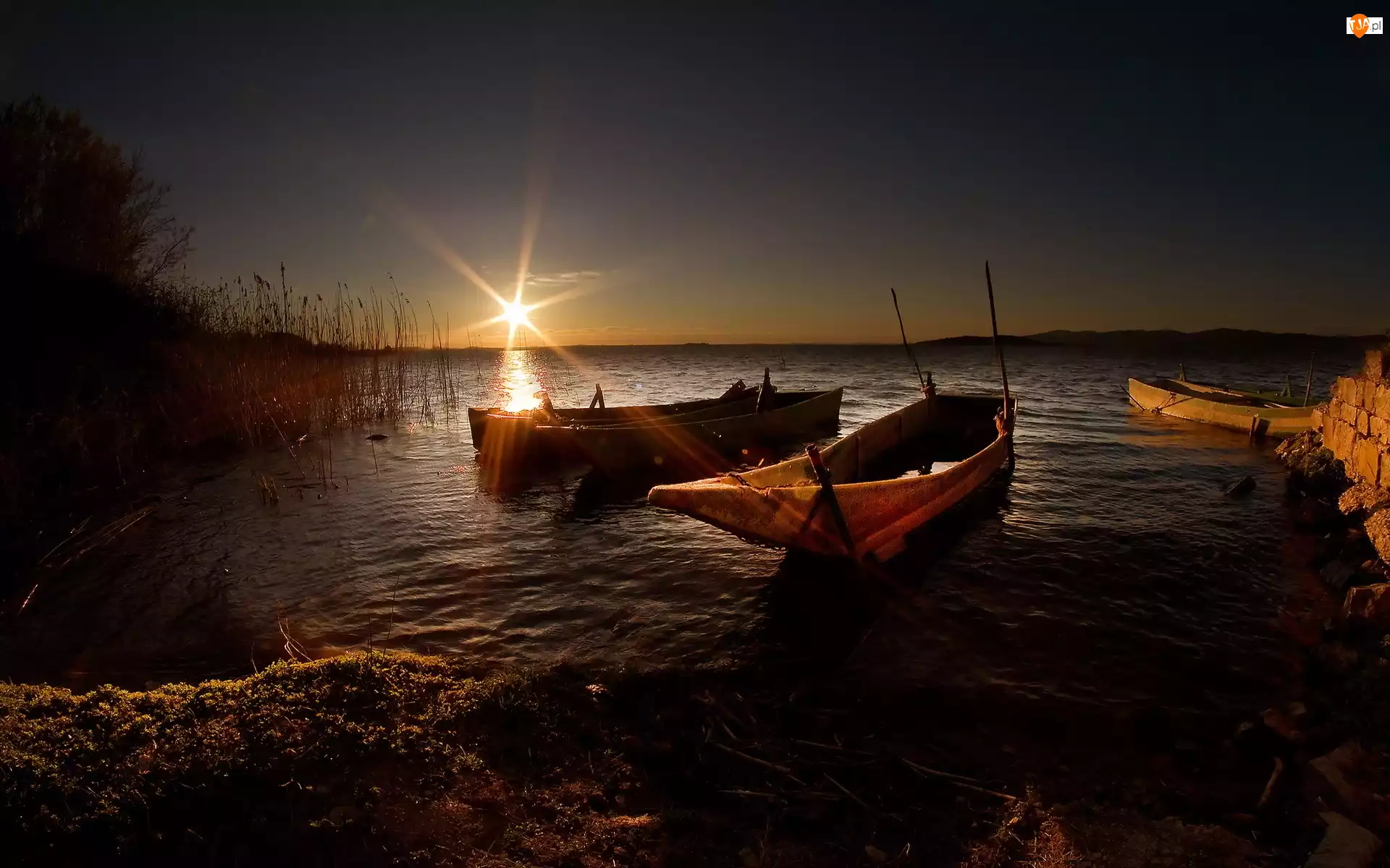 Jezioro, Zachód, Promienie, Słońca, Łajby