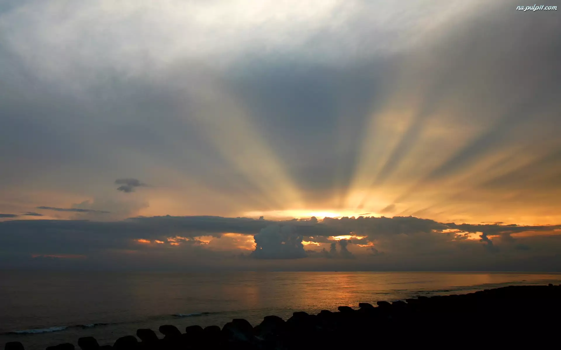 Jezioro, Zachód, Promienie, Słońce, Chmury