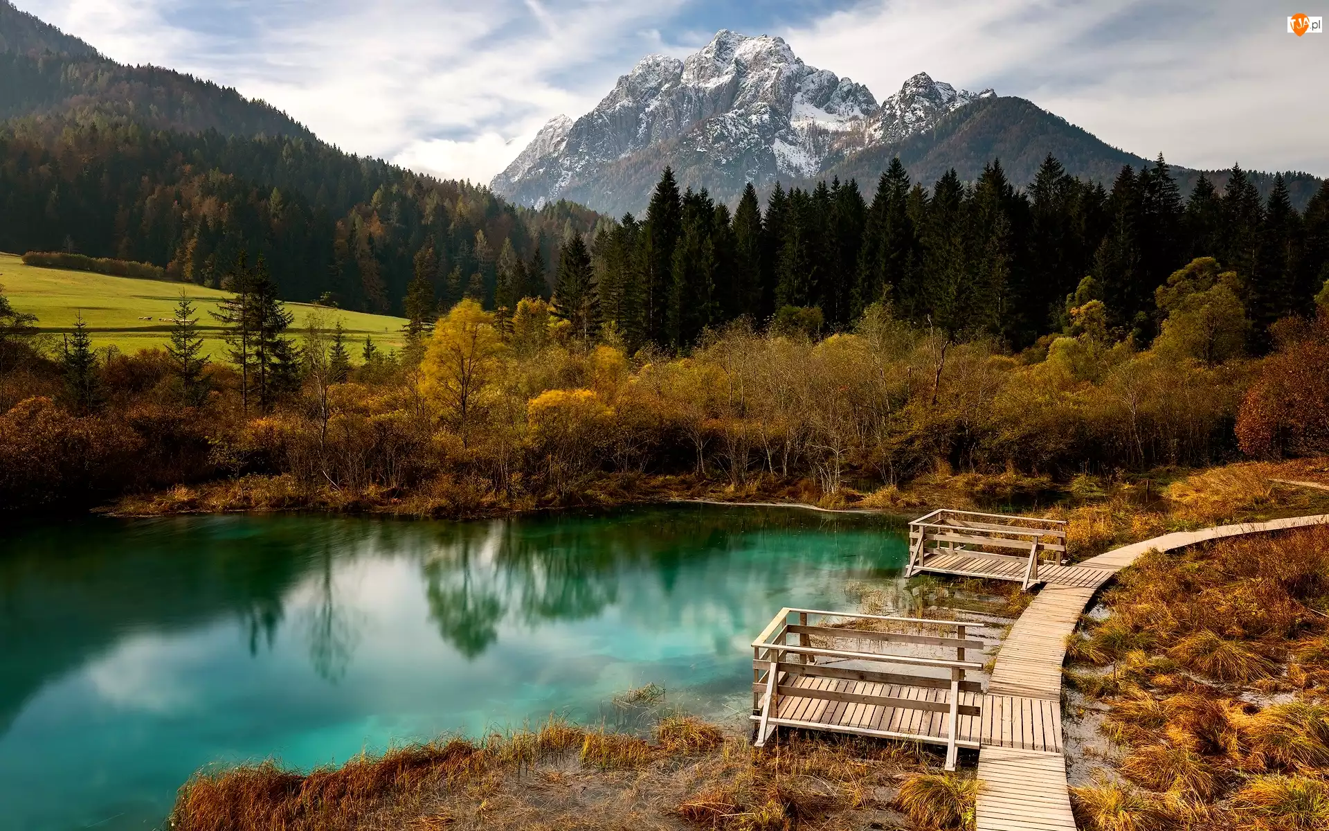Jesień, Kranjska Gora, Pomost, Lasy, Drewniany, Rezerwat przyrody Zelenci, Jezioro Zelenci, Słowenia, Góry