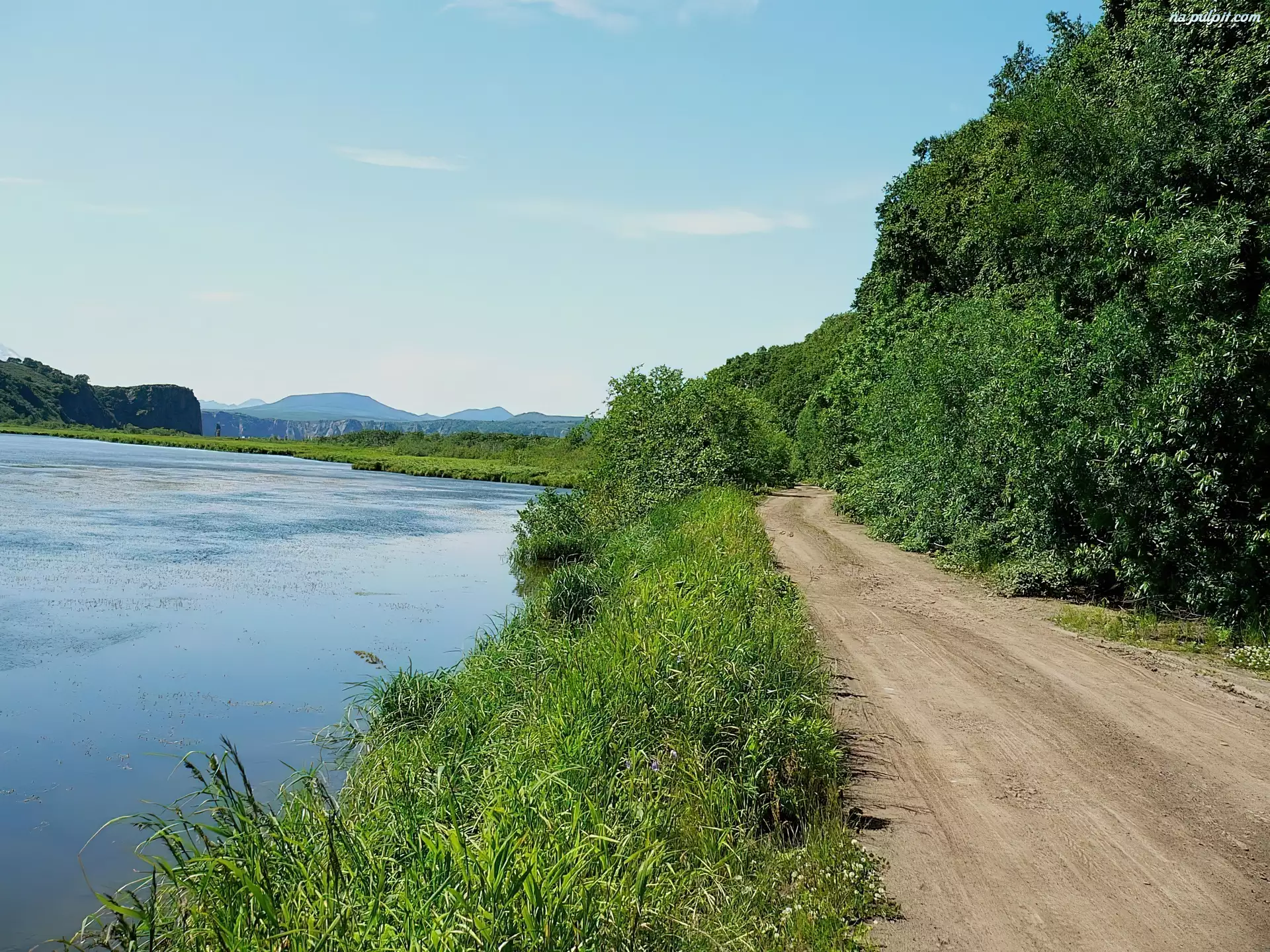 Jezioro, Zieleń, Droga, Drzewa