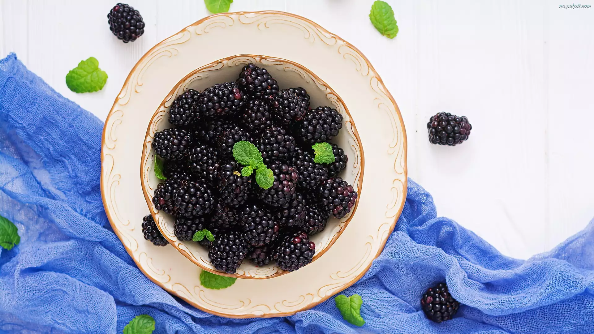 Jeżyny, Talerz, Deski, Owoce, Materiał, Niebieski, Mięta