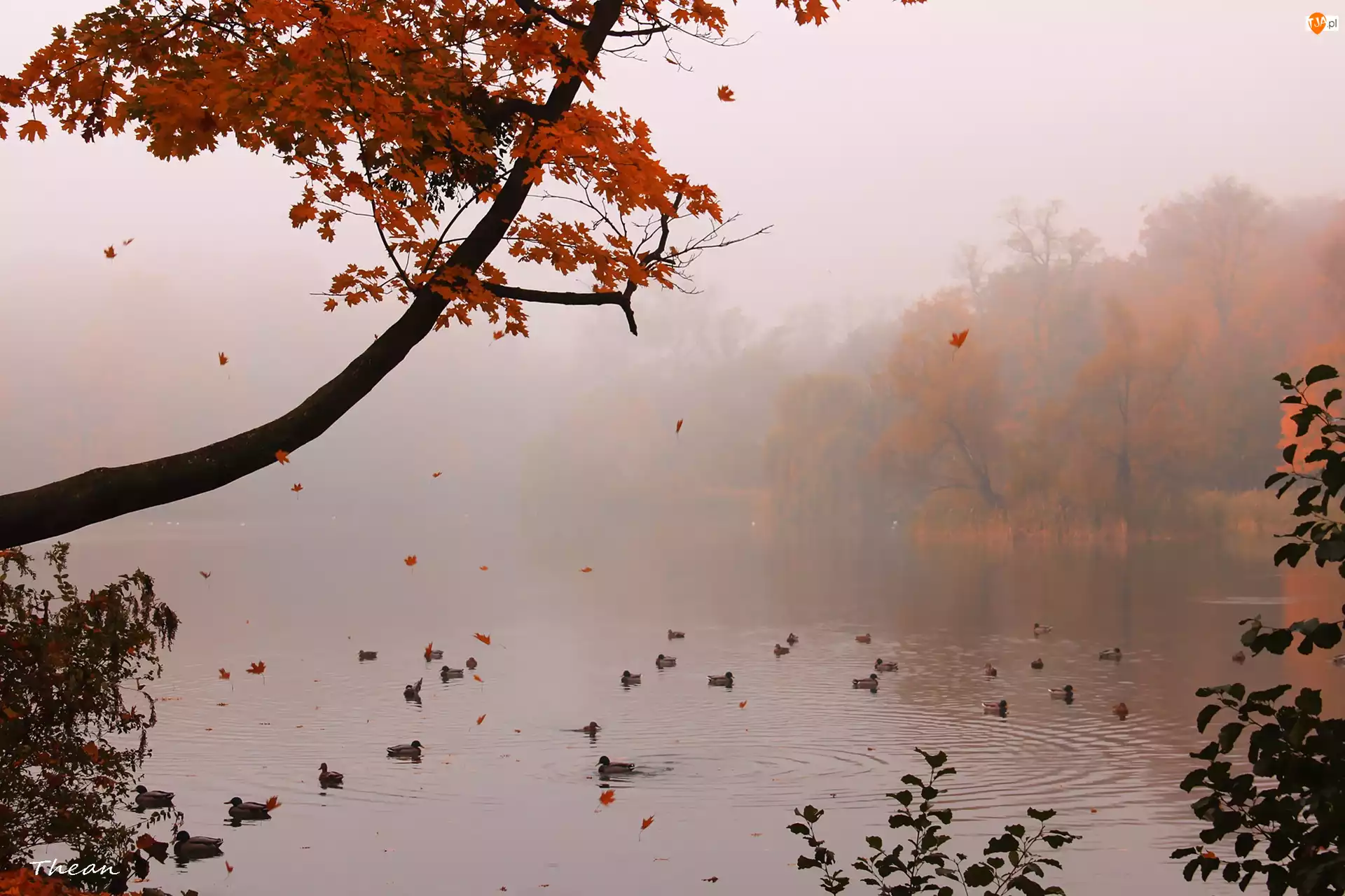 Kaczki, Spadające, Mgła, Liście, Jezioro, Drzewo