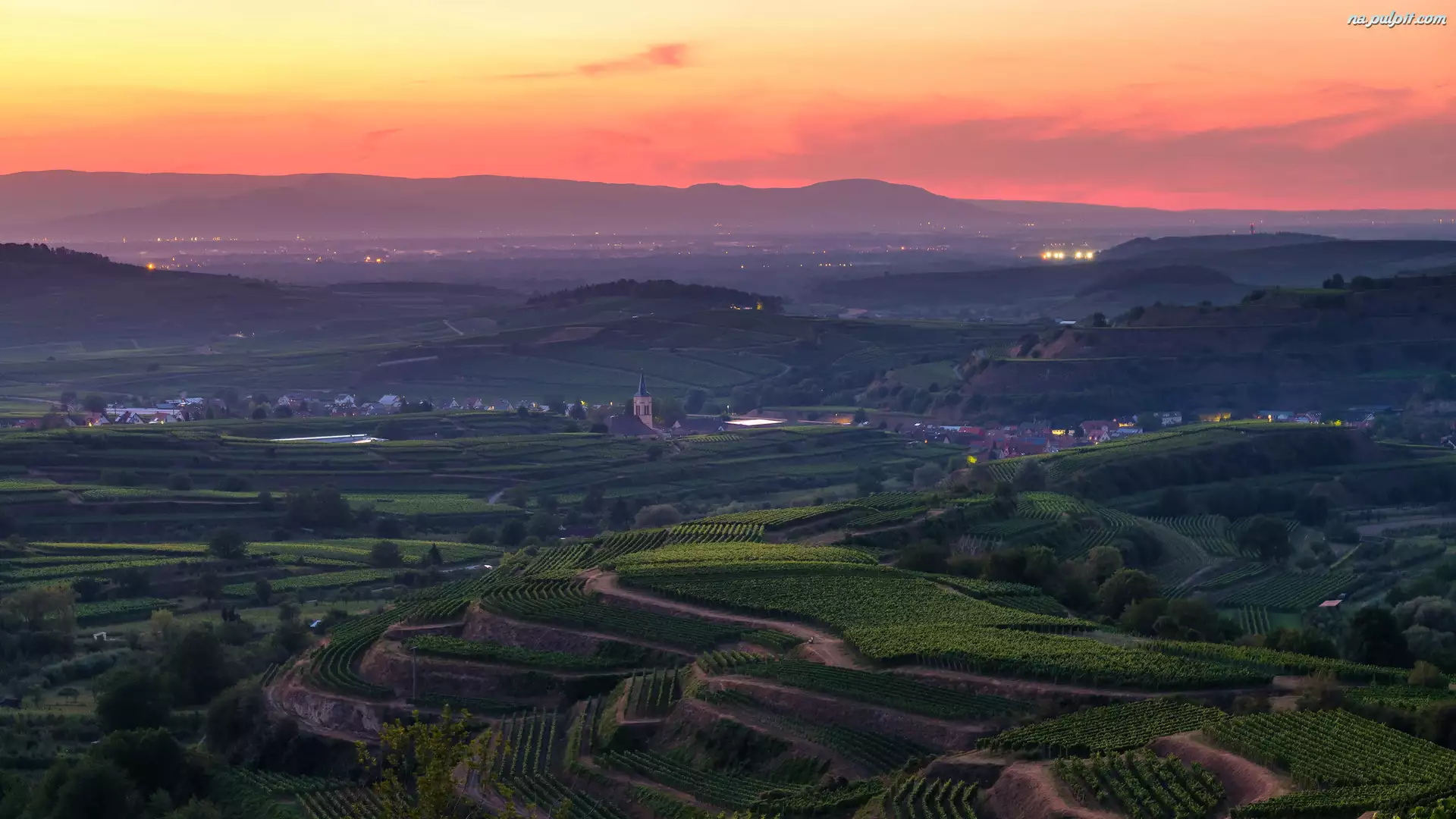 Kaiserstuhl, Zachód słońca, Drzewa Farmy i pola, Niemcy, Winnice, Plantacje, Wzgórza