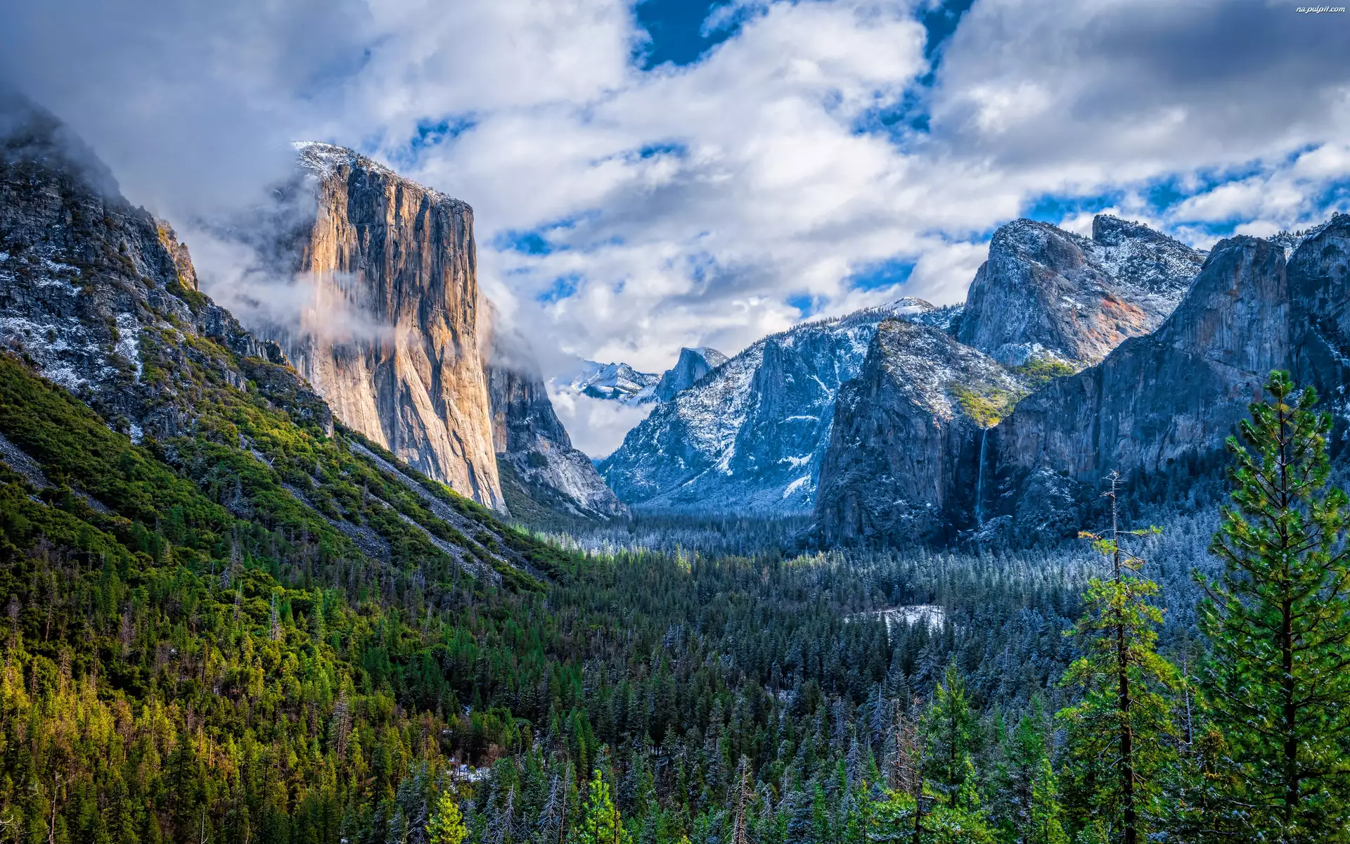 Kalifornia, Dolina Yosemite Valley, Park Narodowy Yosemite, Stany Zjednoczone, Chmury, Lasy, Góry Sierra Nevada