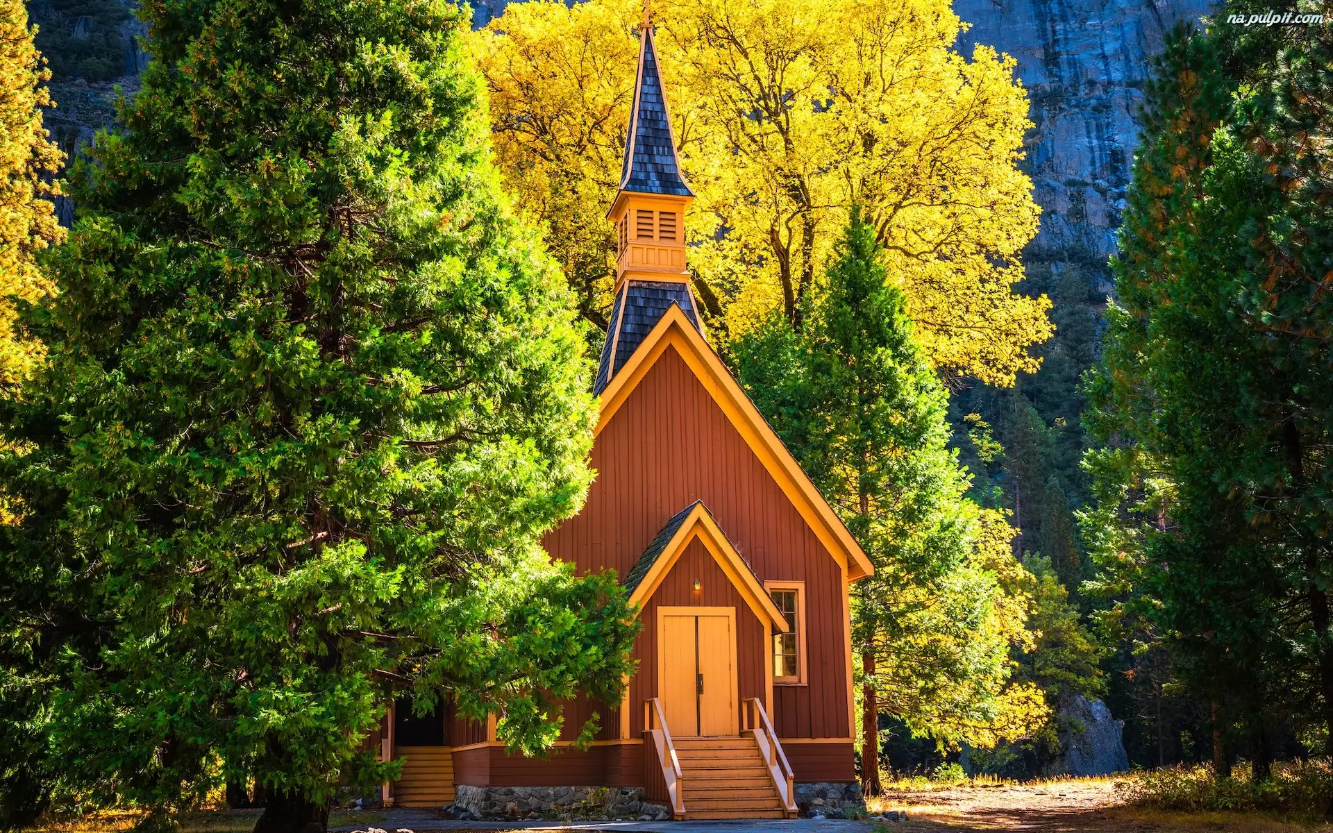 Kalifornia, Park Narodowy Yosemite, Jesień, Stany Zjednoczone, Drzewa, Kaplica, Kościół
