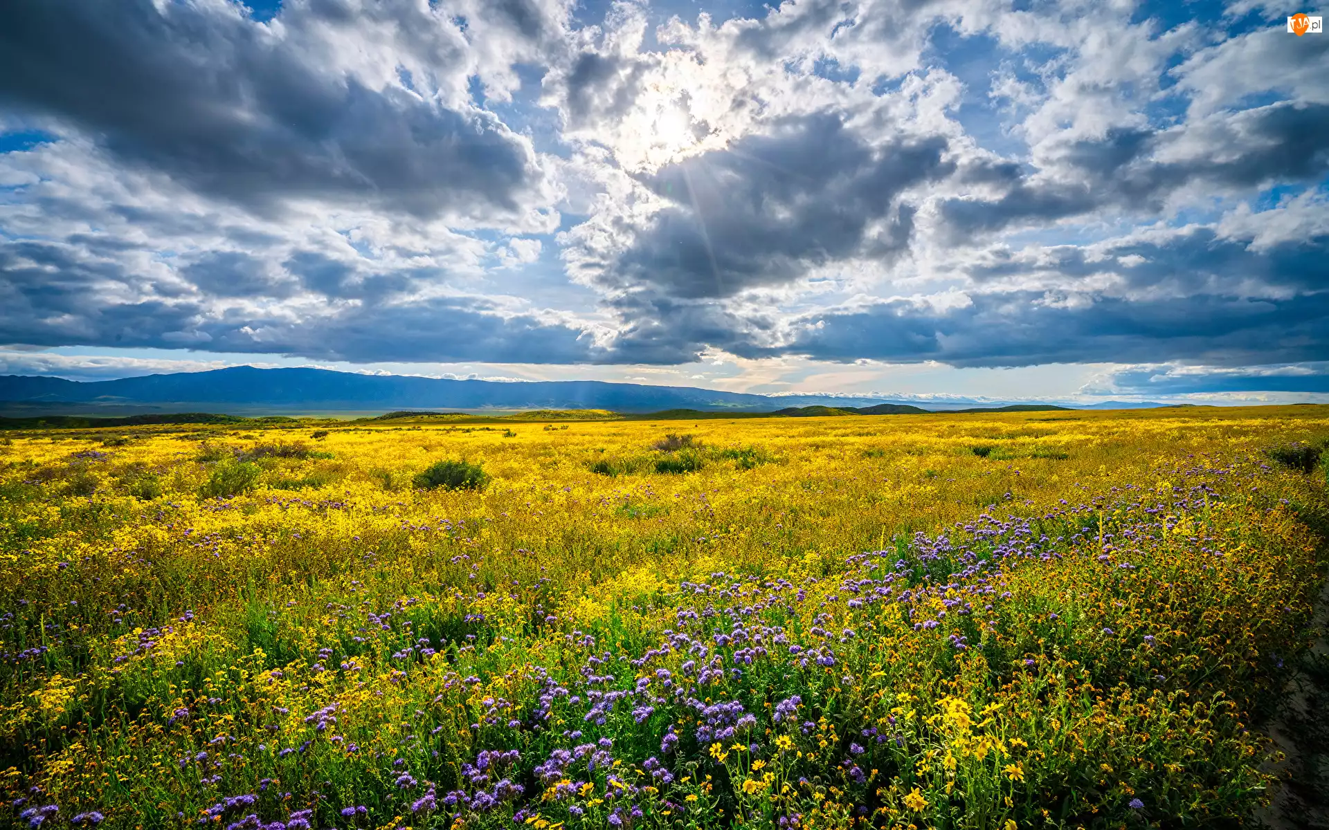 Kalifornia, Pomnik Narodowy Równiny Carrizo, Chmury, Stany Zjednoczone, Promienie słoneczne, Kwiaty, Łąka