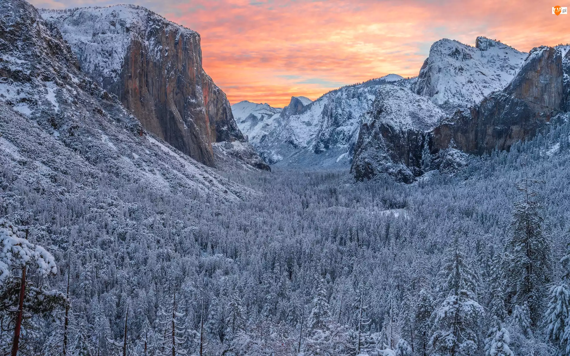 Kalifornia, Stany Zjednoczone, Góra El Capitan, Park Narodowy Yosemite, Skały, Drzewa, Zima