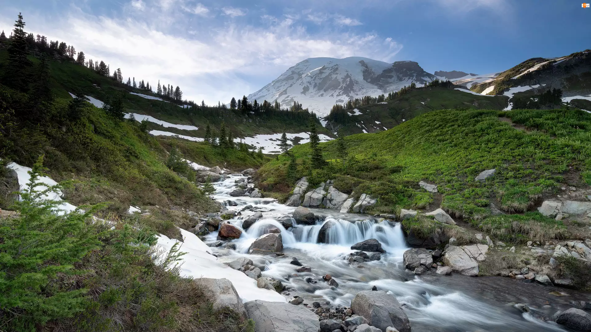 Kamienie, Góry, Kaskada, Strumień, Trawa