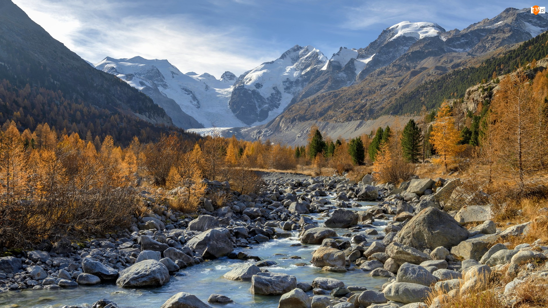 Dolina Morteratsch, Góry, Drzewa, Kanton Gryzonia, Rzeka, Jesień, Szwajcaria, Kamienie