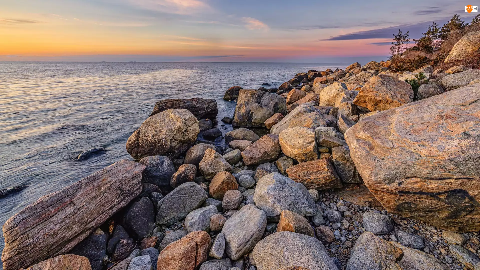Stany Zjednoczone, Morze, Connecticut, Głazy, Madison, Hammonasset Beach, Plaża, Wschód słońca, Kamienie