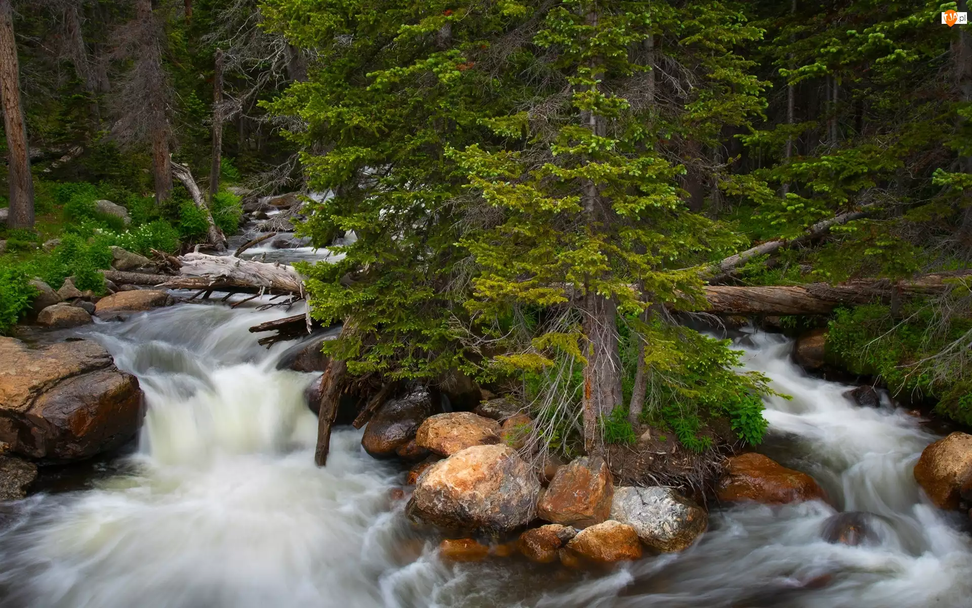 Kamienie, Las, Powalone, Rzeka, Drzewa