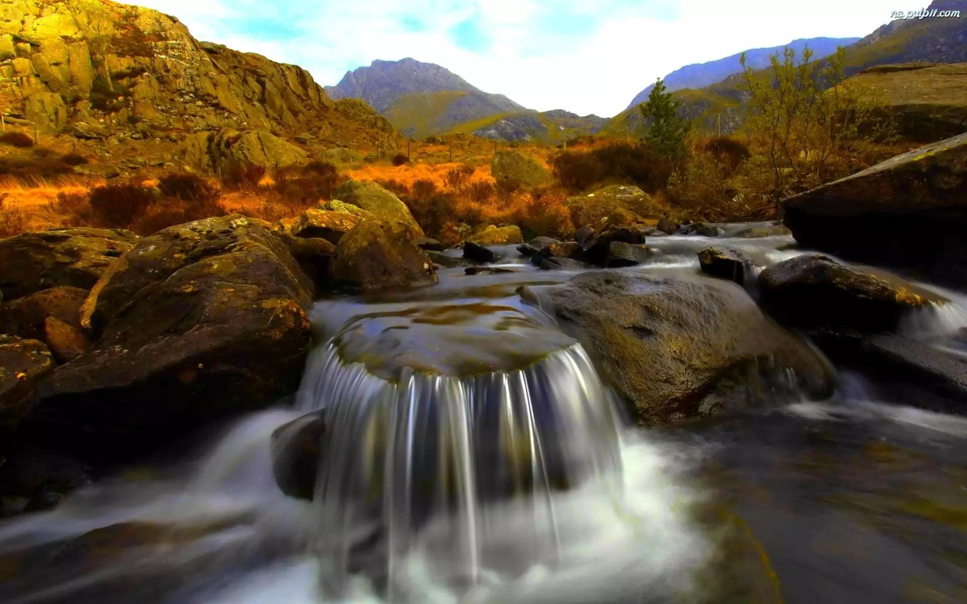 Kamienie, Rzeczka, Krzewy, Wodospad, Góry