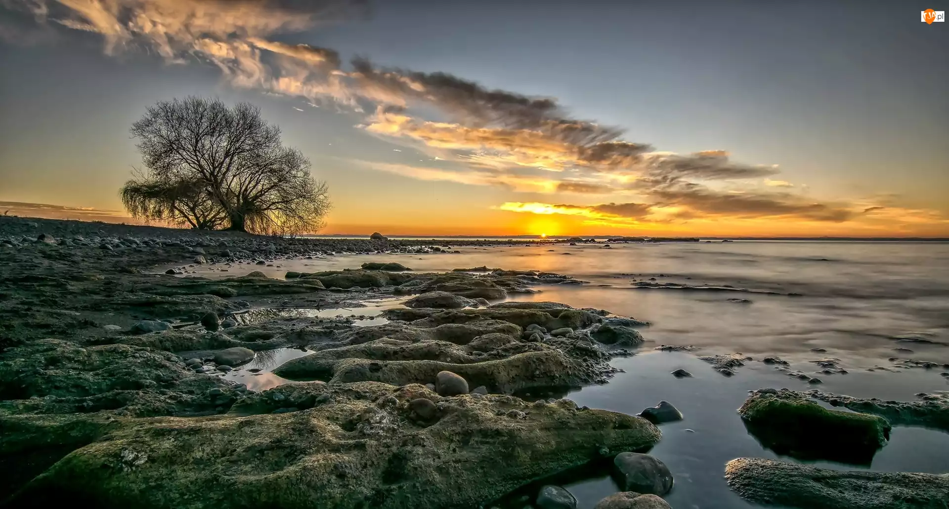 Kamienie, Słońca, Morze, Drzewo, Omszałe, Zachód