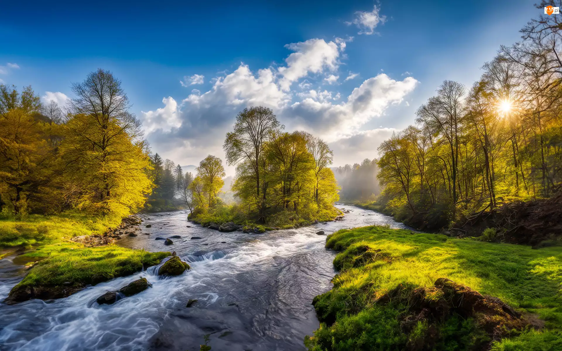 Kamienie, Trawa, Rzeka, Wschód słońca, Drzewa