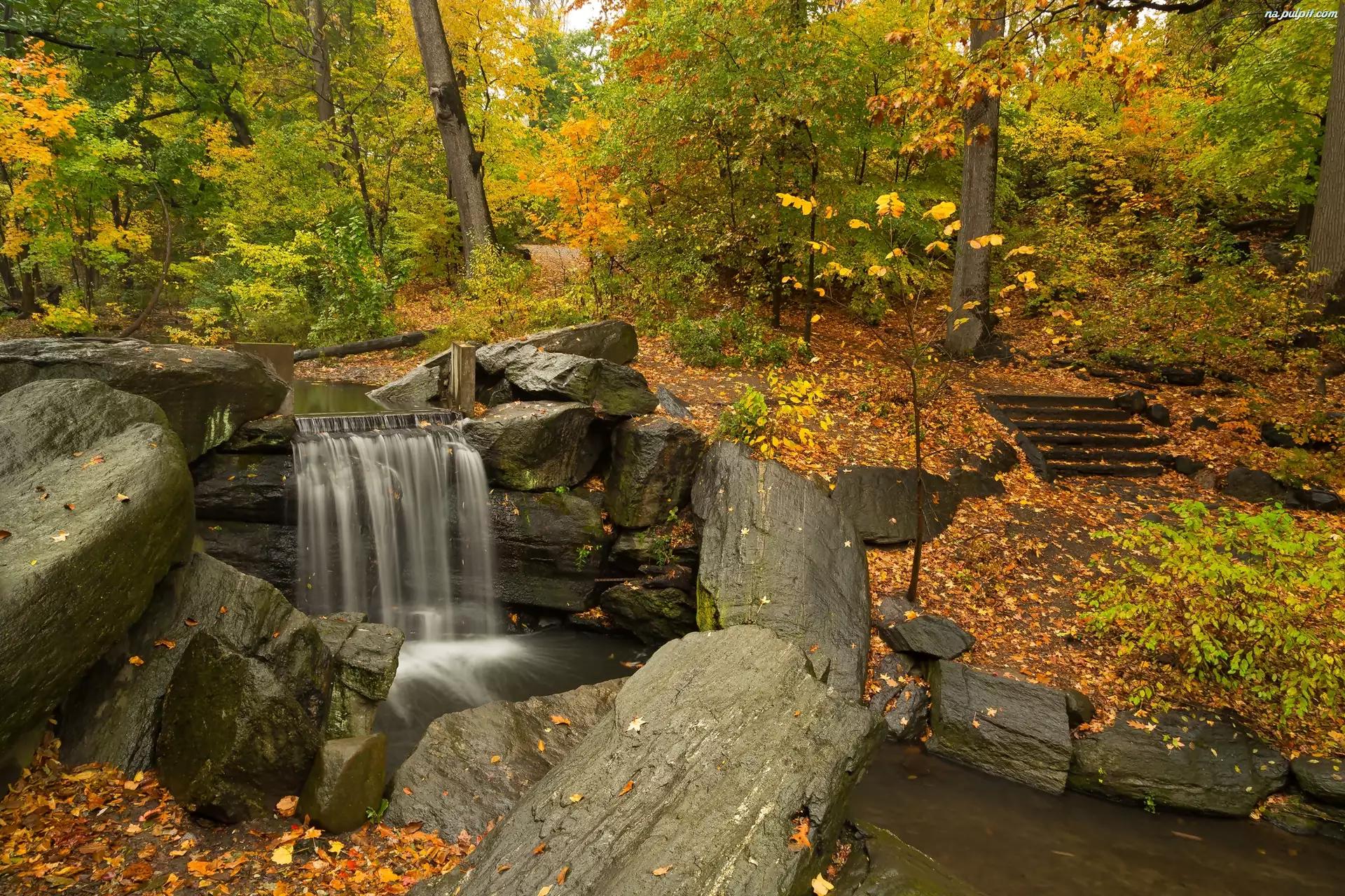 Kamienie, Wodospad, Jesień, Park, Rzeczka