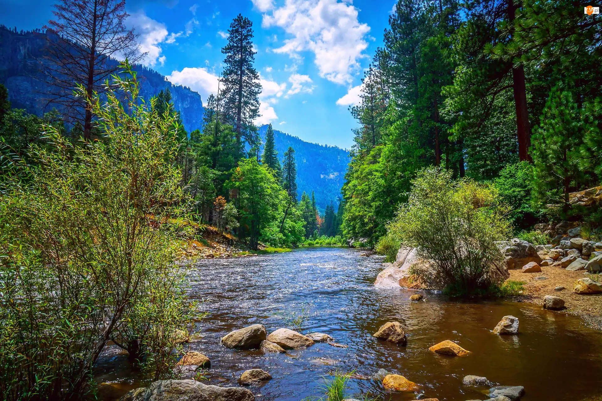 Drzewa, Rzeka, Stan Kalifornia, Stany Zjednoczone, Las, Park Narodowy Yosemite, Góry