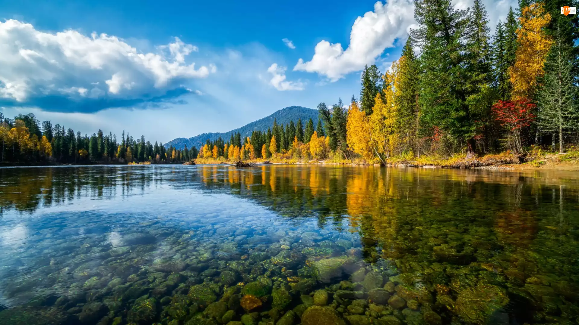 Jezioro, Jesień, Drzewa, Chmury, Kamienie, Góry