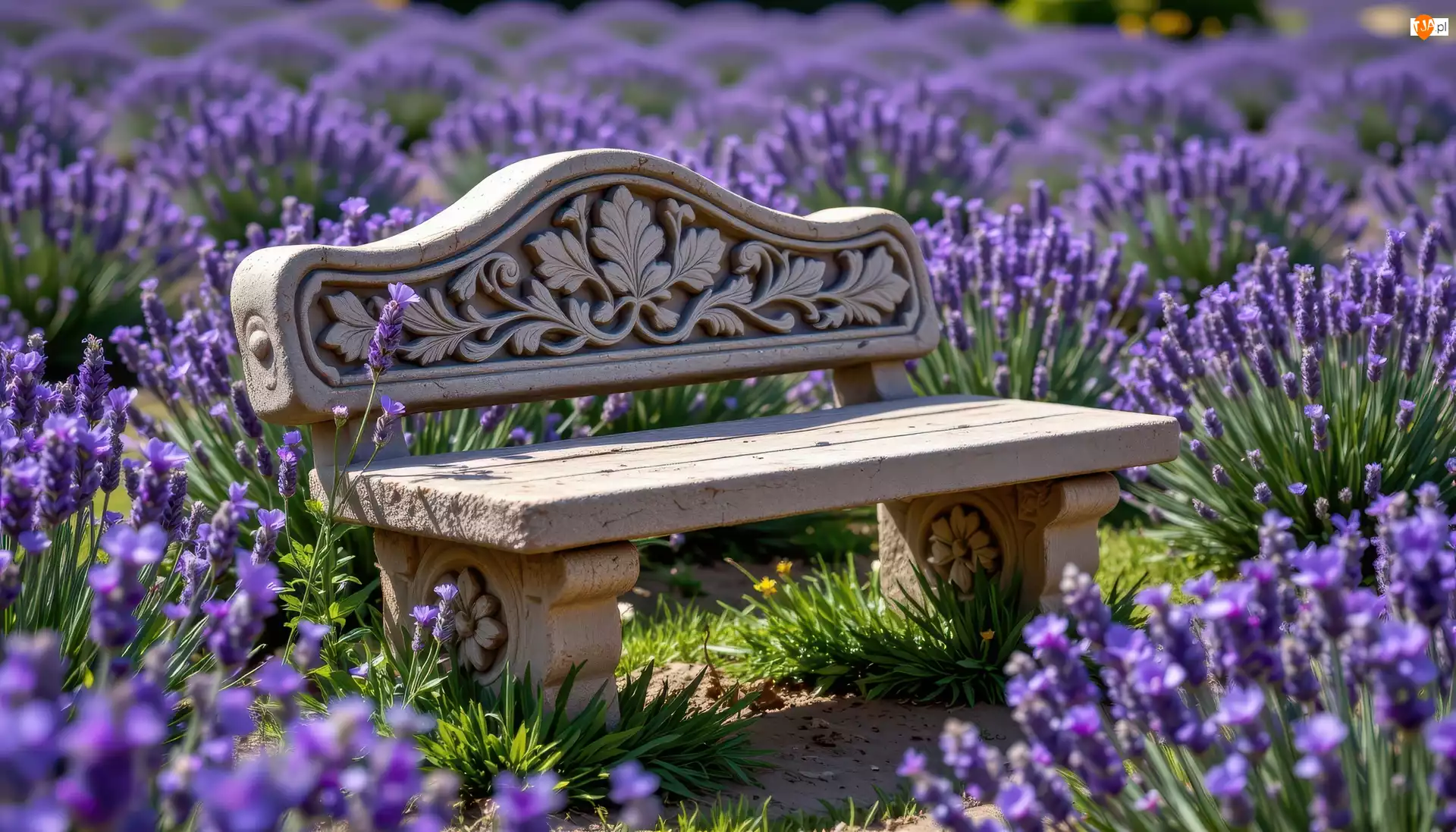 Kamienna ławka na polu lawendy