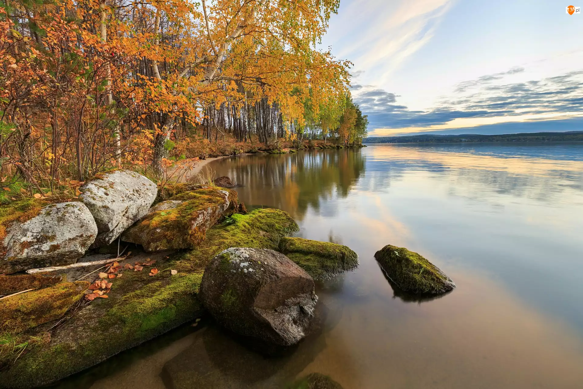 Jezioro Tavatuy, Omszałe, Ural, Drzewa, Rosja, Brzozy, Jesień, Kamienie