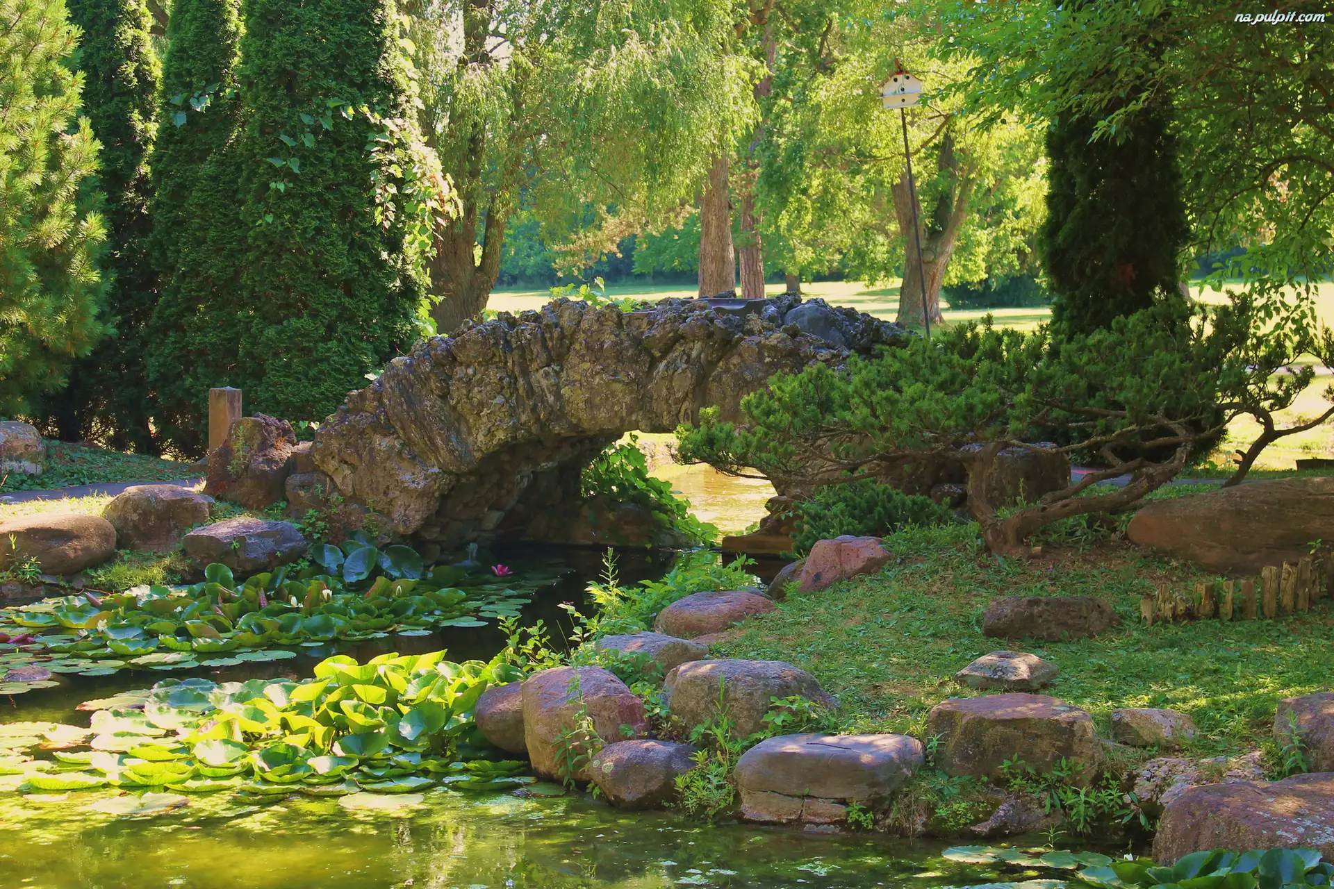 Drzewa, Staw, Kamienie, Park, Mostek, Kamienny, Lilie wodne