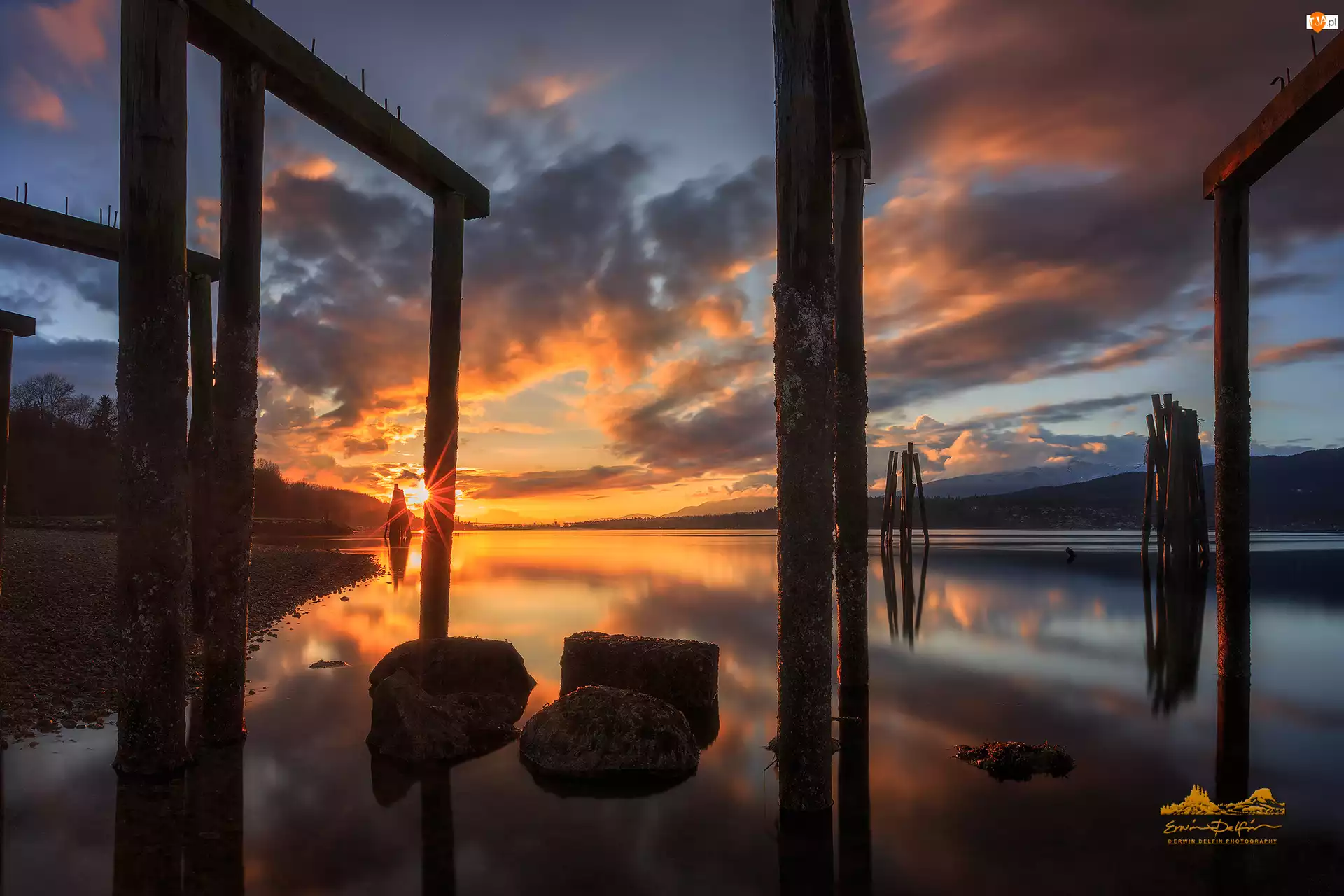 Kanada, Barnet Marine Park, Burnaby, Chmury, Kamienie, Zachód słońca, Drewniane, Zatoka Burrard, Filary