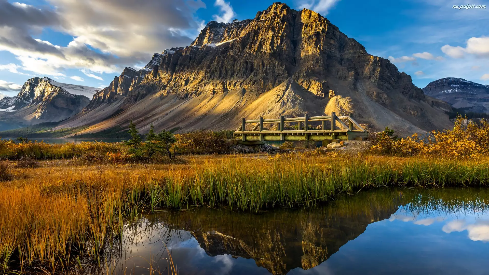 Kanada, Góra, Park Narodowy Banff, Mostek, Odbicie, Crowfoot Mountain, Jezioro, Góry, Bow Lake