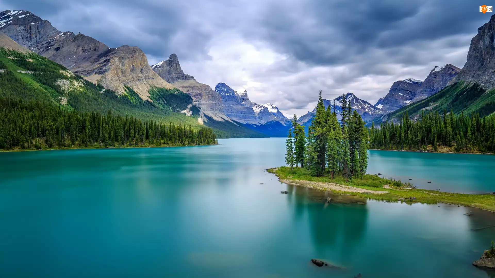Kanada, Góry, Prowincja Alberta, Drzewa, Chmury, Jezioro, Maligne Lake, Park Narodowy Jasper, Wyspa Duchów