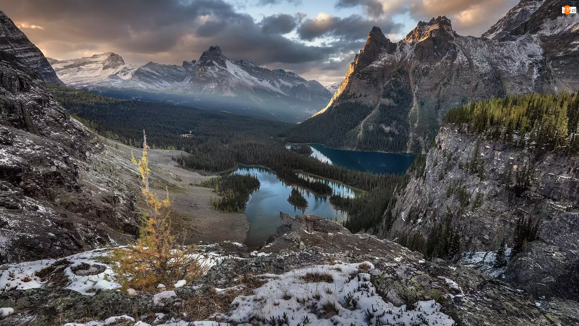 Kanada, Park Narodowy Yoho, Kolumbia Brytyjska, Lake OHara, Chmury, Drzewa, Jeziora, Góry, Mary Lake